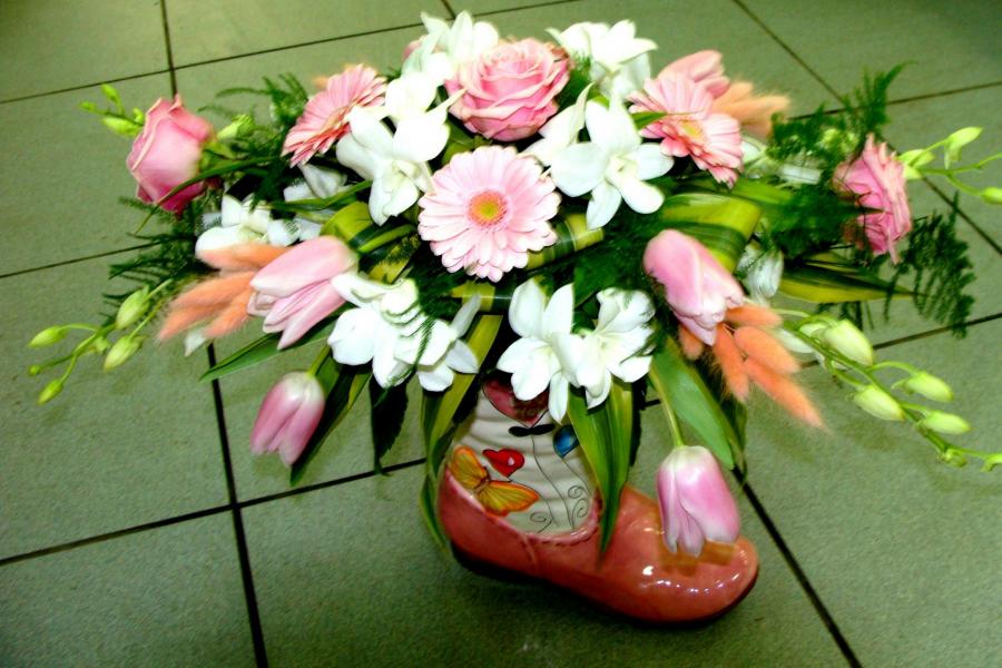2010г. Композиция из живых цветов. Состав: Гербера, тюльпаны, розы. Цвет: Бело-розовый. Ваза-сапожок