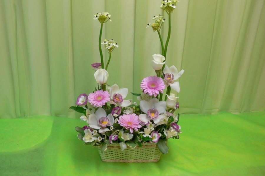 2010г. С живыми цветами. Состав: Гербера, роза, орхидея, орнитогалум. Цвет: Розово-белый