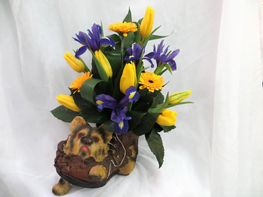 2015г. Композиция из живых цветов. Состав: Тюльпаны, ирисы. Цвет: Желто-синий. Размер (30х20х30) нц