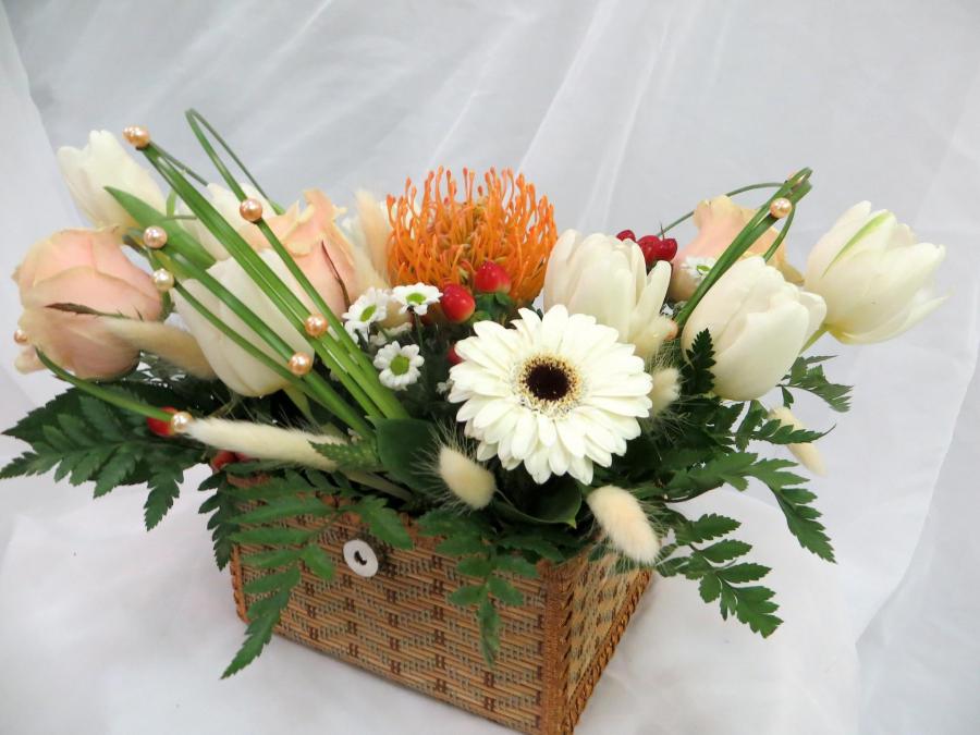 2015г. Композиция из живых цветов. Состав: Гербера,роза, тюльпаны, левкосперум. Размер (35х25х20)