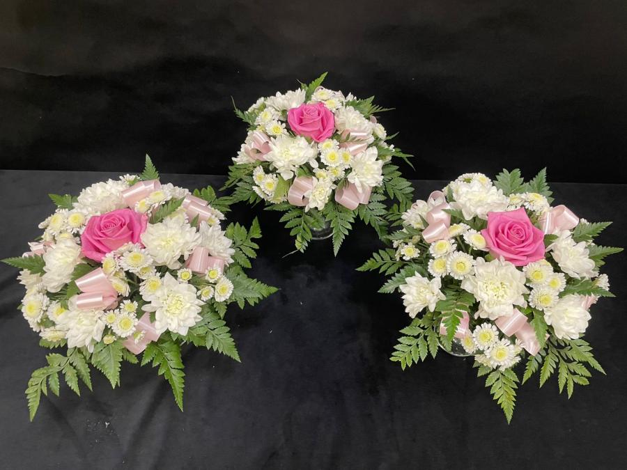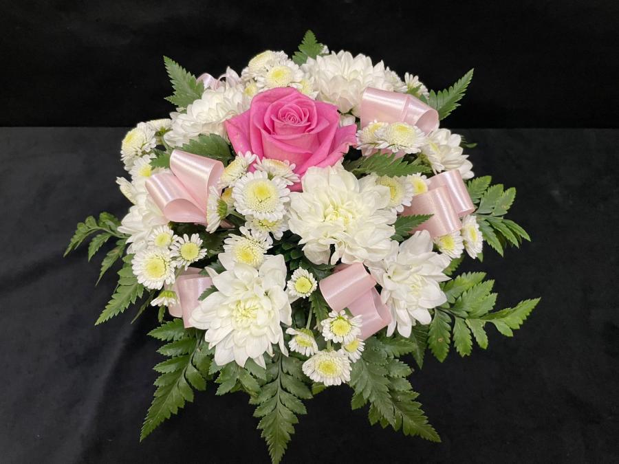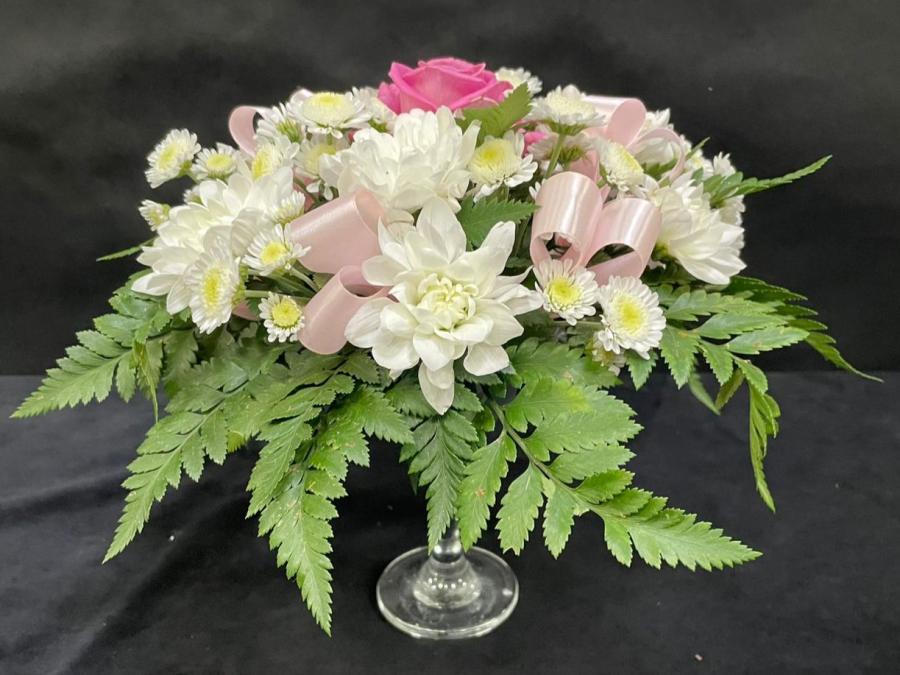2025г. Цветы на свадьбу. Композиция на гостевой стол. В стекляной вазе. Состав: Роза, хризантема, папоротник. Цвет: Розово белый с зеленым. Размер (23х23х25) .