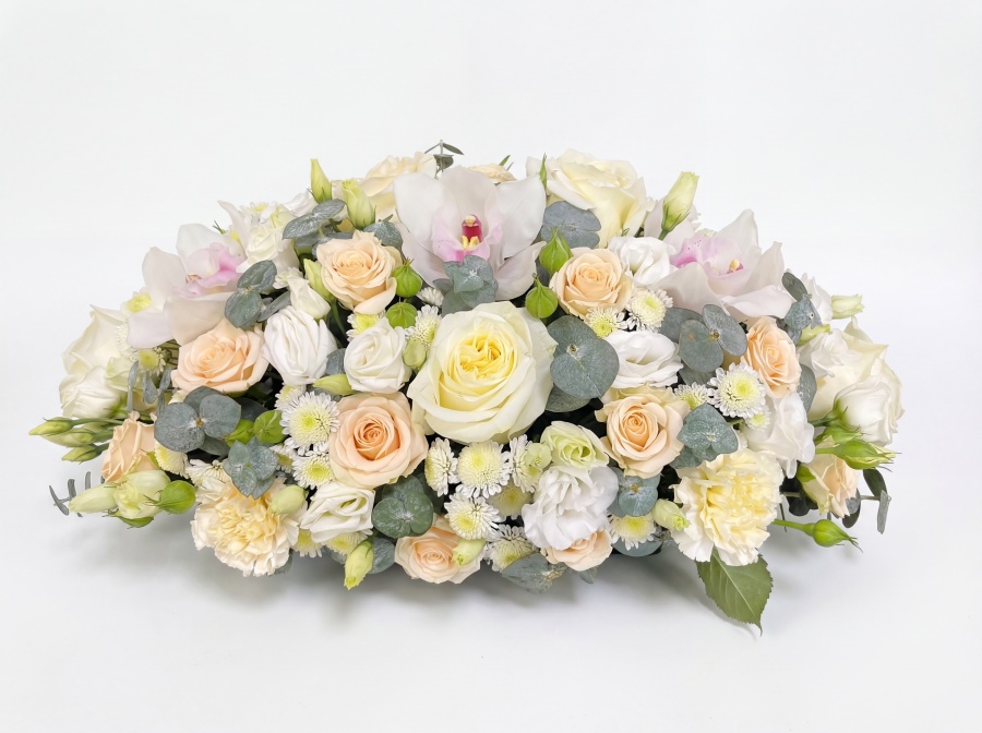 2026г. Цветы на стол жениха и невесты. Эта композиция говорит без слов: «Мы разные, но теперь мы вместе. И это гармония». Композиция приковывает взгляд, подчёркивает важность момента. Живые цветы здесь подобраны так, чтобы выдержать весь день торжества: плотные бутоны, стойкая зелень, продуманная конструкция. Состав: Орхидея, роза, роза кустовая, эустома, гвоздика, эвкалипт. Цвет: Белый кремовый розовый с зеленым. Размер (45х25х18)