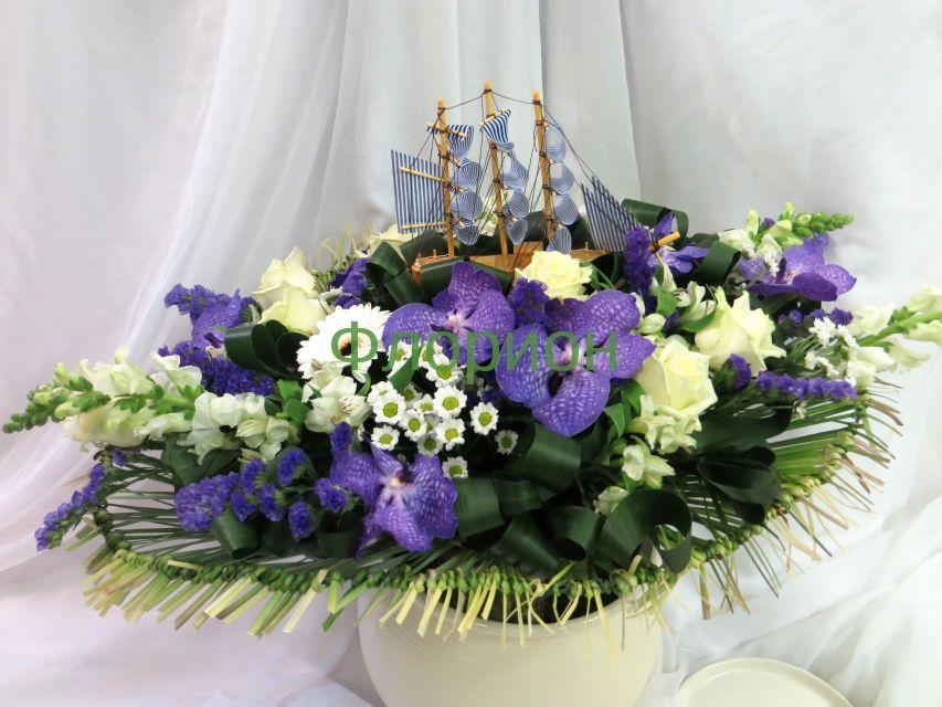 2015г. Композиция-букет на день рождения, юбилей. Форма корабль. Цвет: Сиренево-белый. Размер (60х35х35) нц 2022