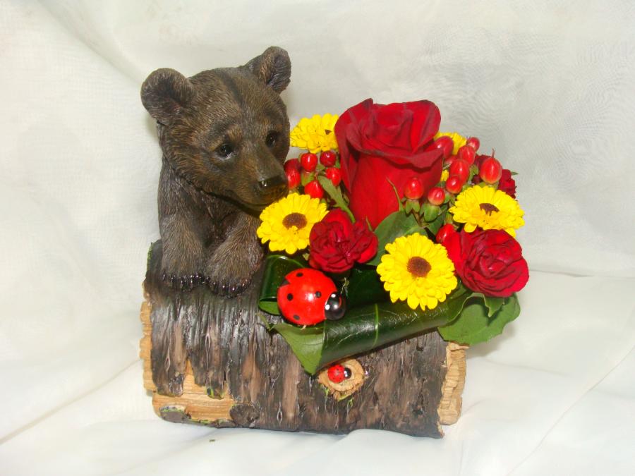 2011г. Композиция из живых цветов детям. Состав: Роза, хризантема. Цвет: Красно-желтый. Размер (30х20х25).
