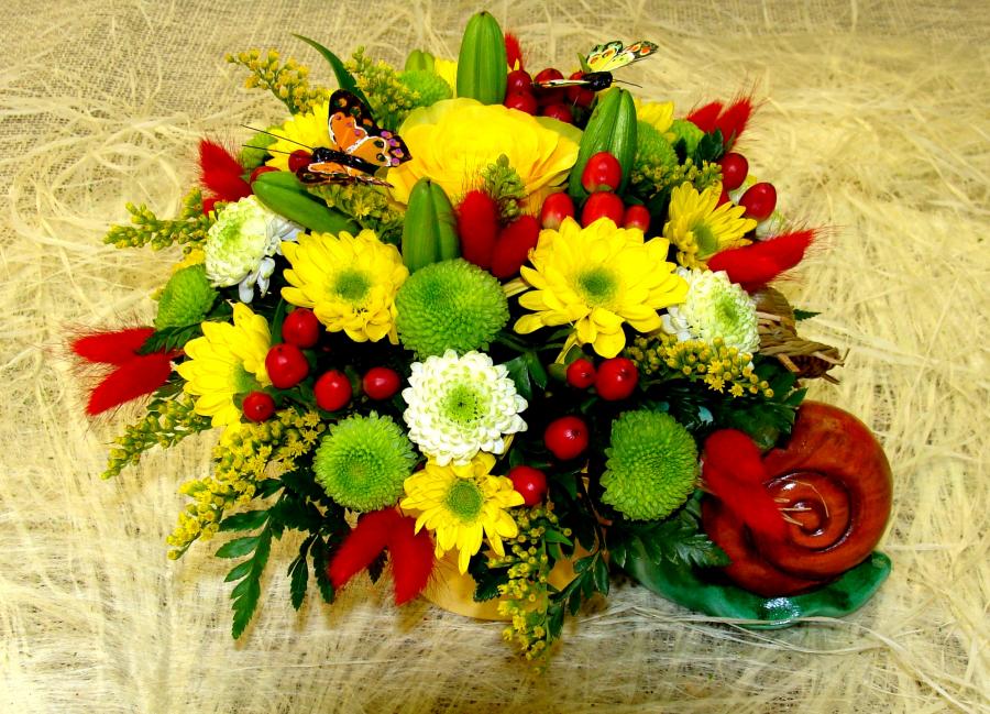 2010г. Композиция из живых цветов. Состав: Роза, хризантема. Цвет: Желто-красный