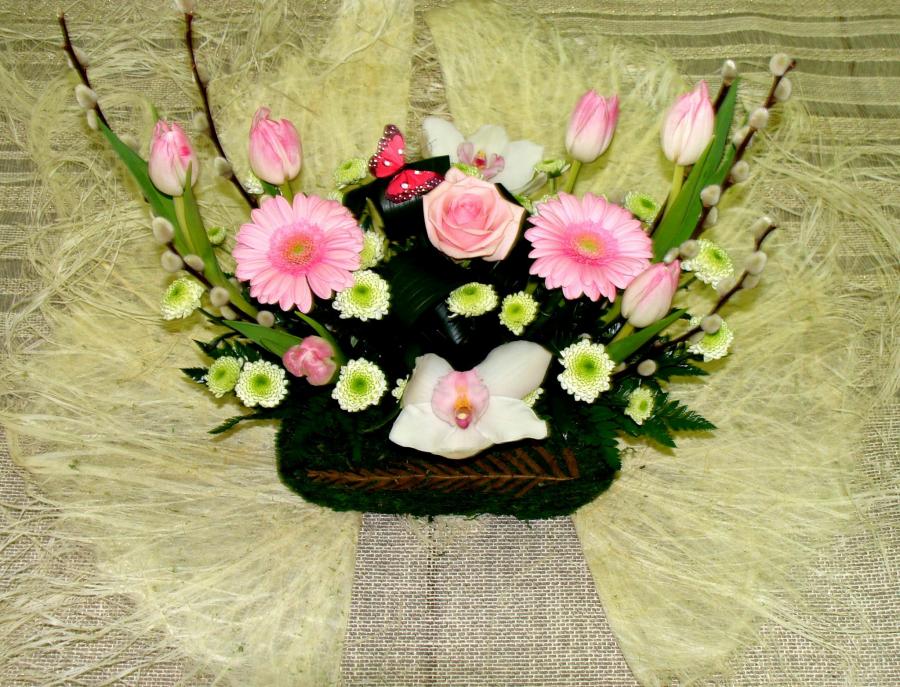 2010г. Состав: Гербера, тюльпаны, роза, орхидея. Цвет: Розово-белый