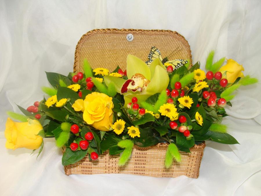 2010г. Композиция с живыми цветами. В соломенной коробке. Цвет: Желто-красный. Состав: Роза, орхидея.