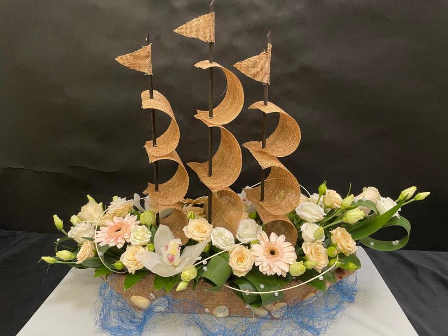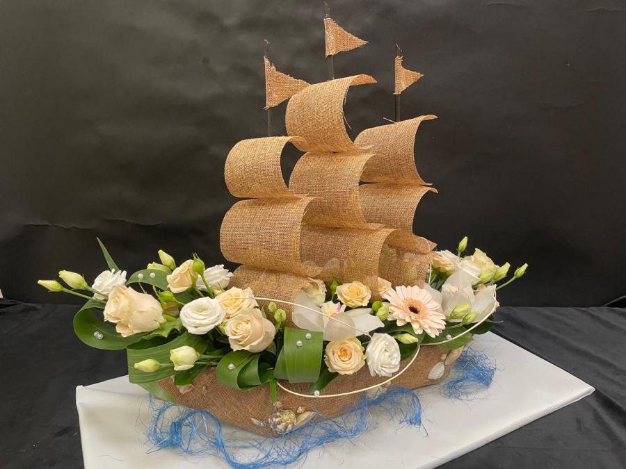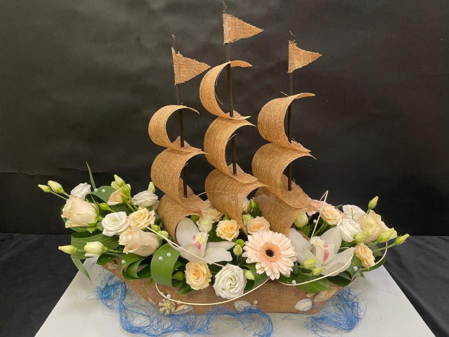 2025г. Композиция из живых цветов корабль. Состав: Гербера, роза кустовая, гербера, орхидея, зелень с жемчугом. Цвет: Коричнево-кремовый. Размер (60х28х50)