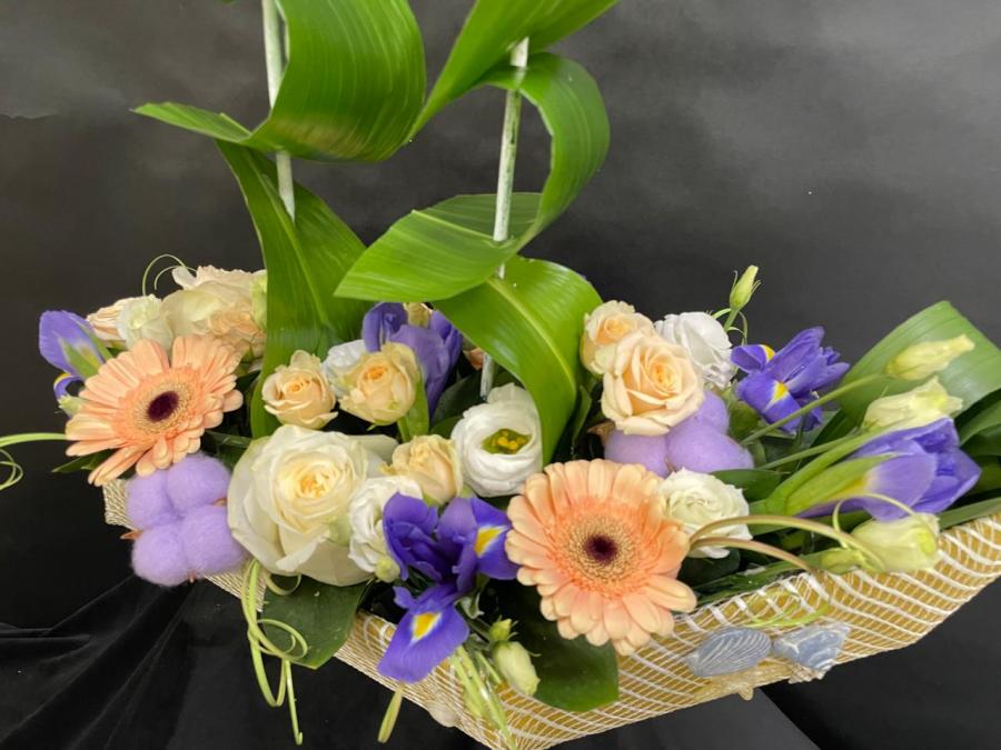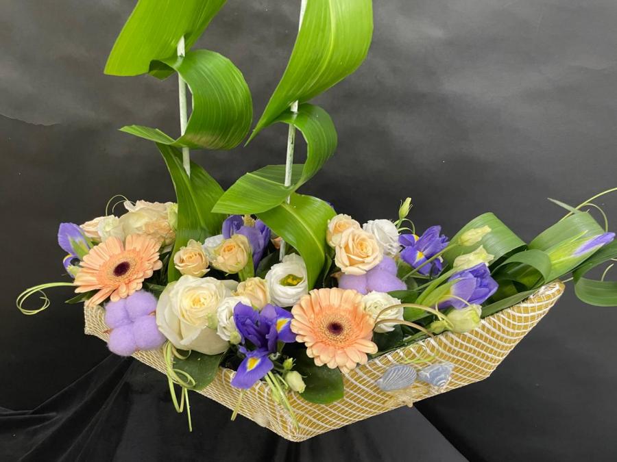 2025г. Композиция из живых цветов. Корабль. Состав: Роза, гербера, ирис, хлопок, роза кустовая, альстрамерия. Цвет: Зеленый с сиреневый и кремовым. Размер (57х18х56)