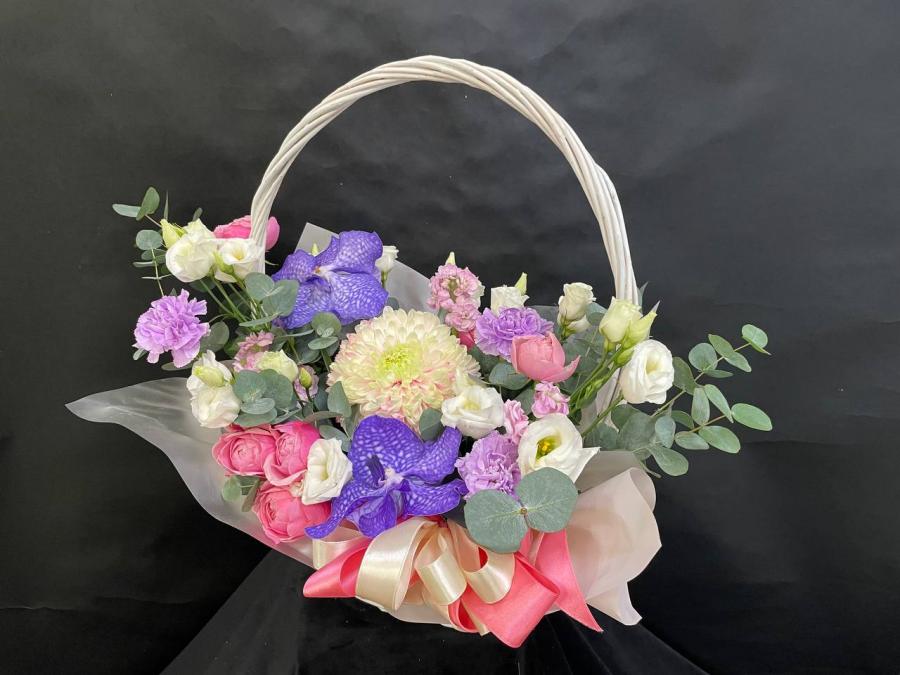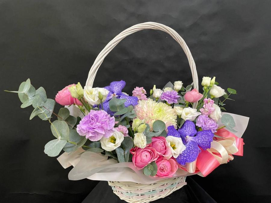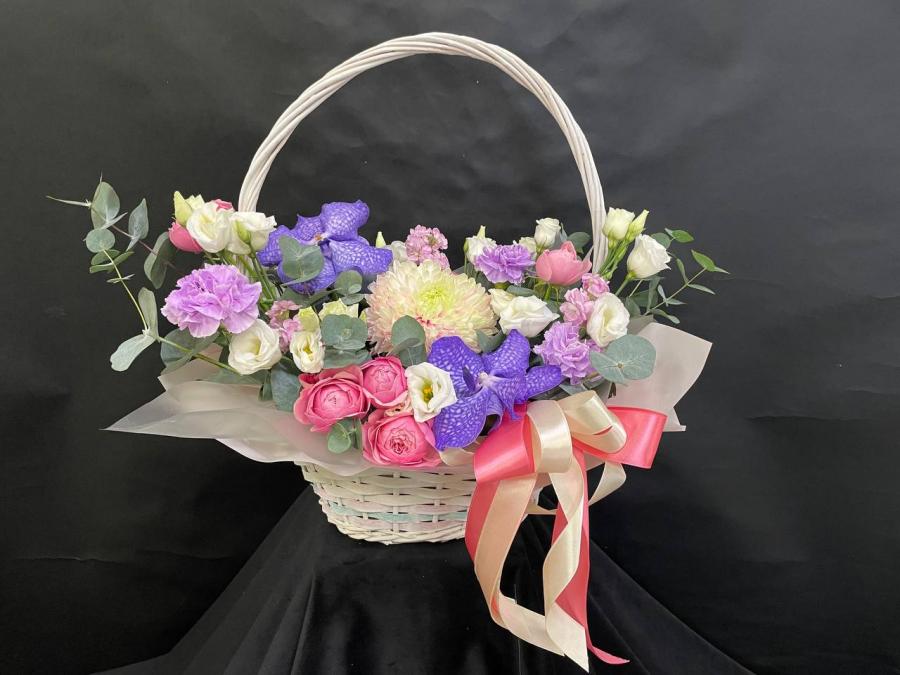 2026г. Корзина из живых цветов для любимой. В розовых синих и белых тонах. Состав: Орхидея ванда, хризантема, пионовидная кустовая роза, диантус, эустома. Размер (45х26х40)