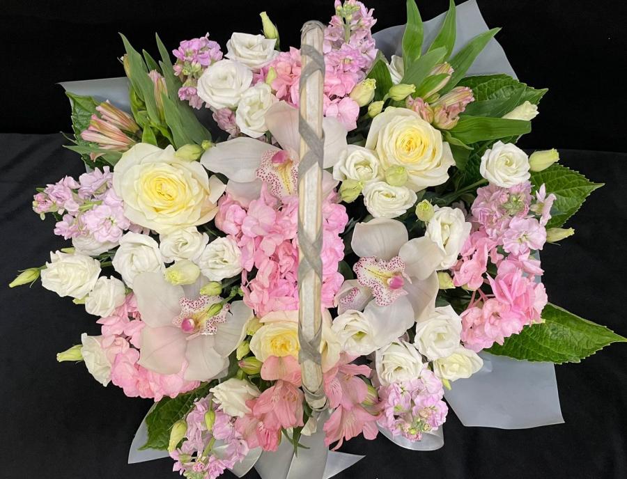2025г. Корзина из живых цветов для любимой. На день рождения. Цветы кому: Любимой, девушке, маме. В розово белых тонах. Состав: Гортензия, маттиола, орхидея, роза, эустома, альстромерия, эвкалипт. Размер (50х40х45)