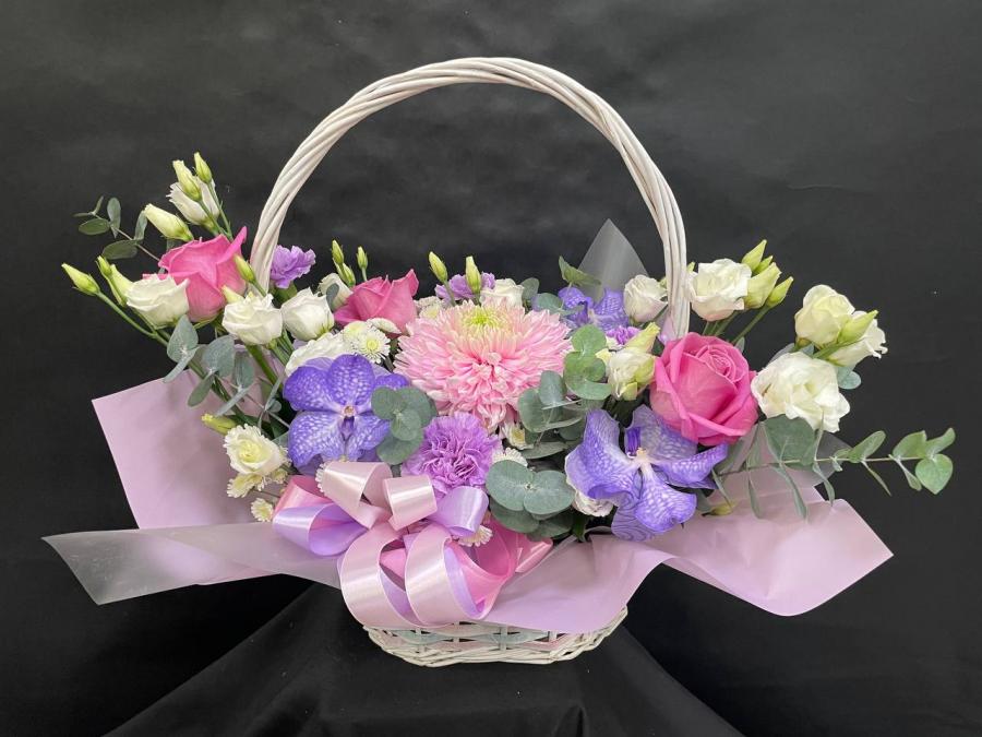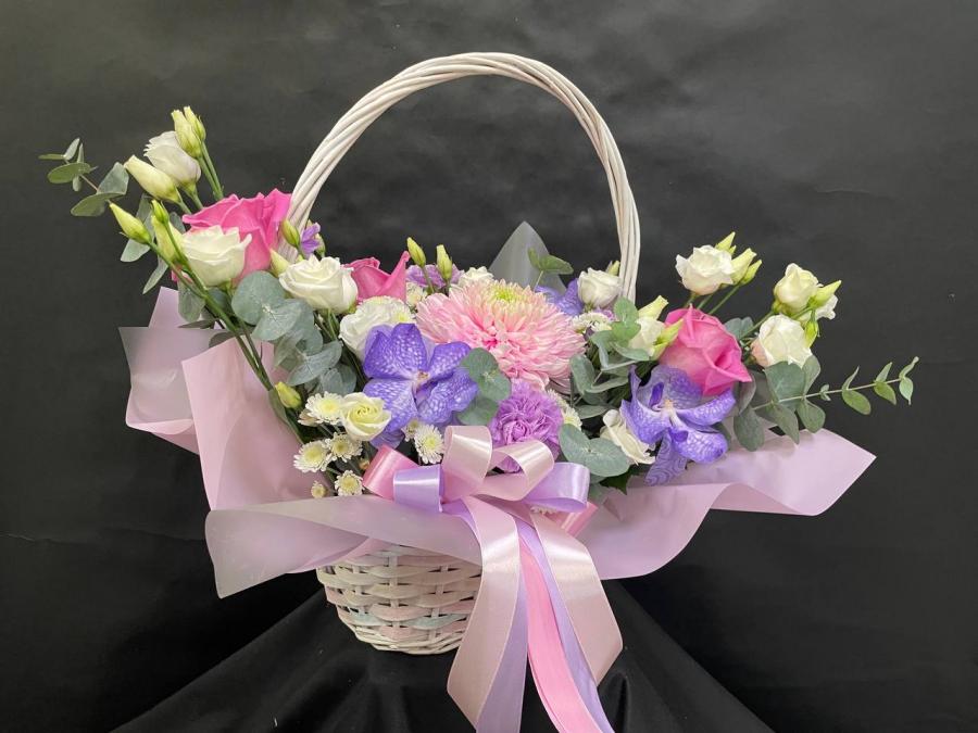 2026г. Корзина из живых цветов для любимой. В розовых синих и белых тонах. Состав: Орхидея ванда, хризантема, роза, диантус, эустома. Размер (45х26х40)