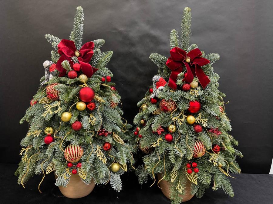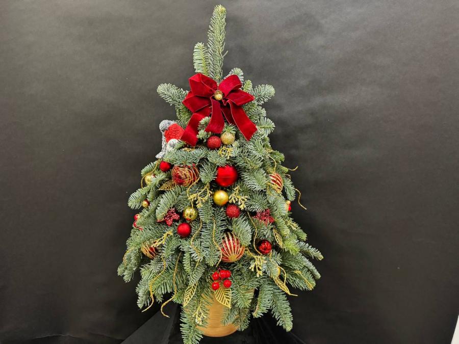 2025 г. Новогодние цветы. Новогодняя ёлка из живых веткок канадской ели «Нобилис», с прздничными игрушками и красныи новогодним бантом. Цвет: зелёный, красный. Размер (35х35х70)