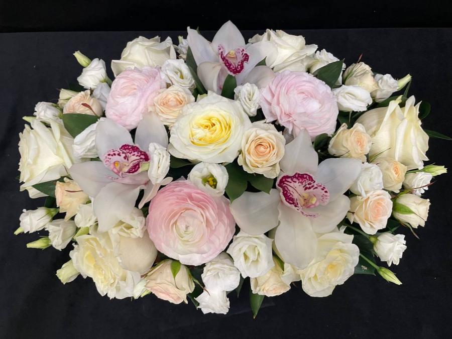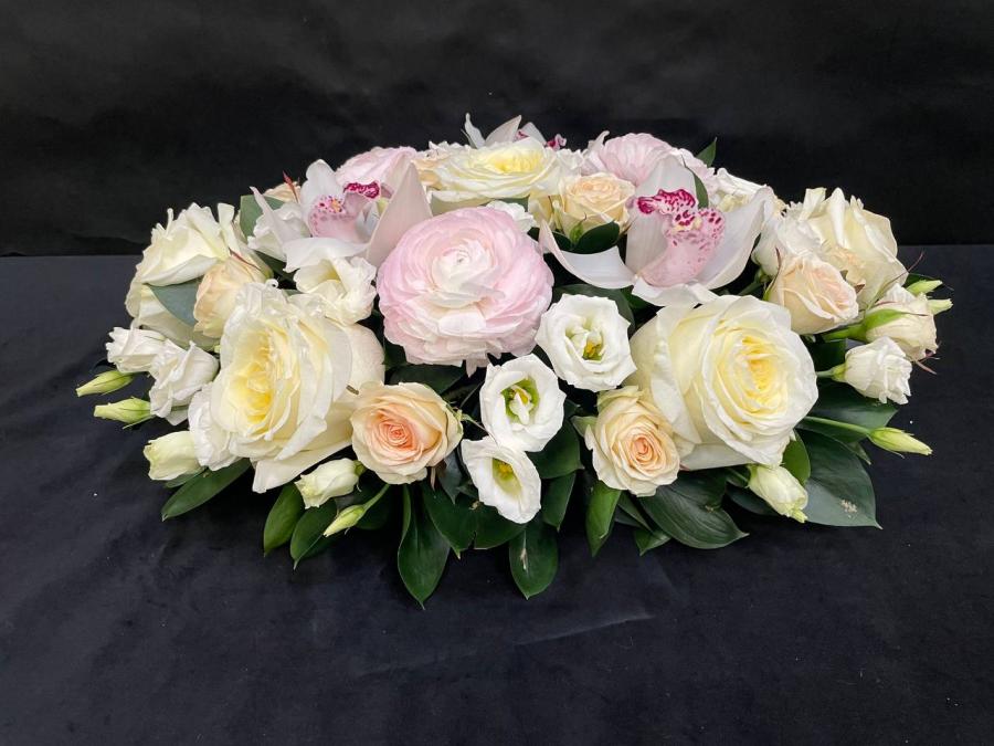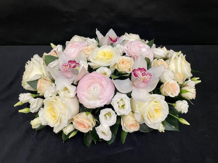 2026г. Цветы на свадьбу. Композиция из живых цветов настольная. На свадебный стол молодоженов. Состав: Орхидея, роза, роза кустовая, ранункусы, эустома. Цвет: Белый кремовый розовй с зеленым. Размер (50х27х18)