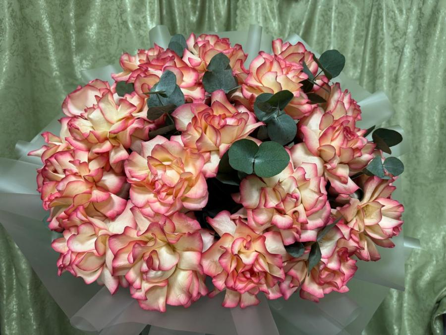 2025г. Монобукет роз. Дорогой на день рождения. Состав: 19 французских роз. Цвет: Бело-краный. Размер (50х50х60). Вес-5.0 Кг. нц 2015