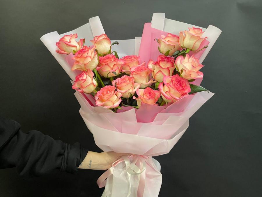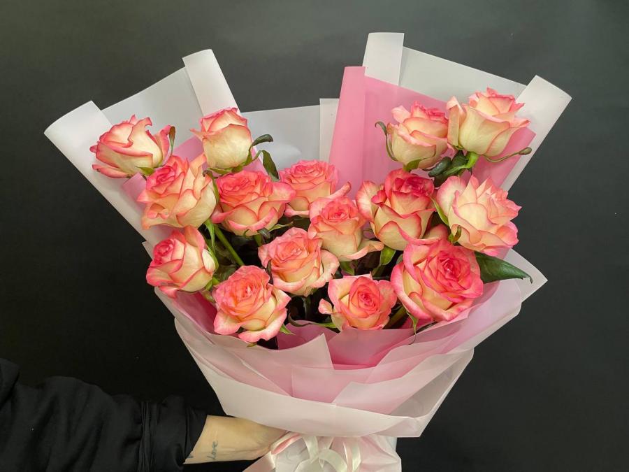 2026г. Букет роз. Форма вертикальная. На праздник. Цветы кому: Любимой, девушке, маме. Состав: 15 роз. Размет (60х35х70) Цвет: Кремовый