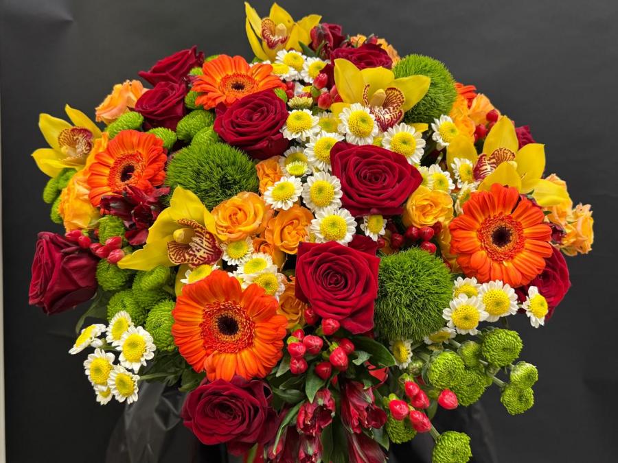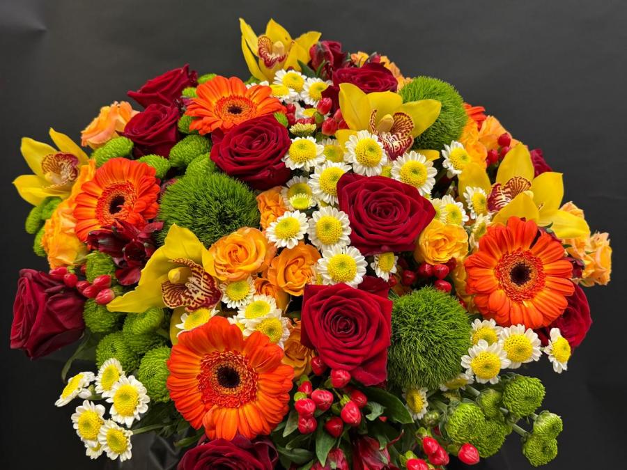 2025г. Цветы на день рождения. Букет из живых цветов. Форма круглая. Состав: Роза, орхидея, гербера, роза кустовая, диантус, хризантема, гиперикум, альстромерия. Цвет: Красно оранжевый с зеленый. Размер (60х60х50)