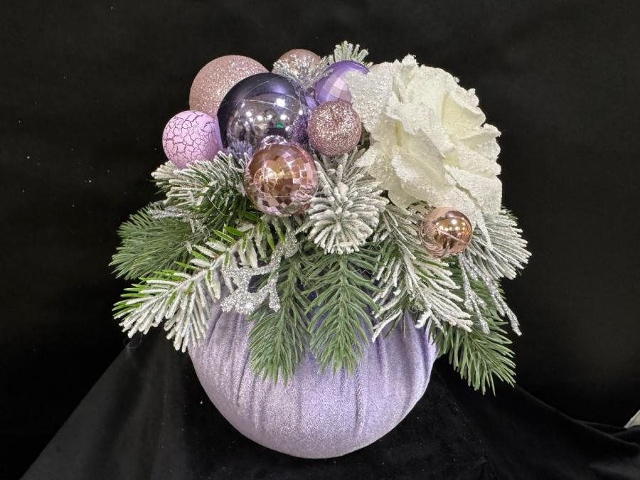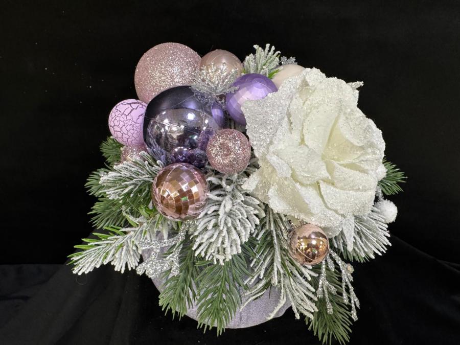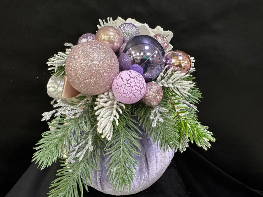 2025г. Новогодняя композиция из искусственных цветов с игрушками. Форма шар. Цвет: зеленый, розовый, белый. Размер (20х20х23). Автор: Наталия. Тел. для связи: +79161252945