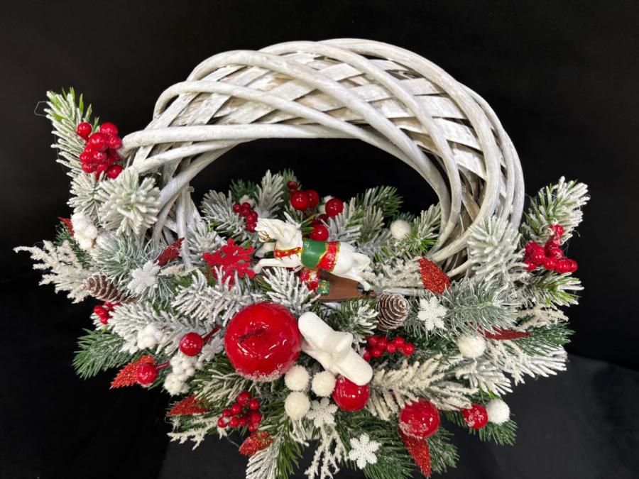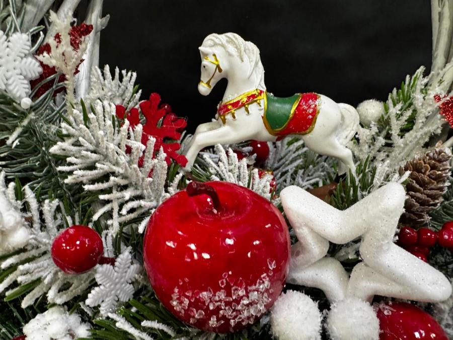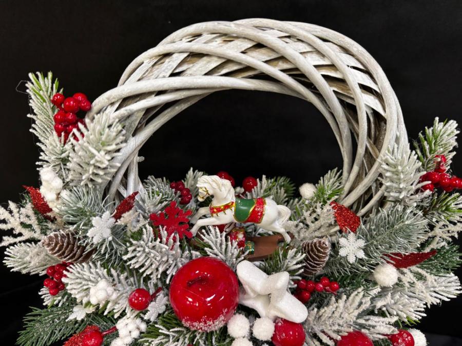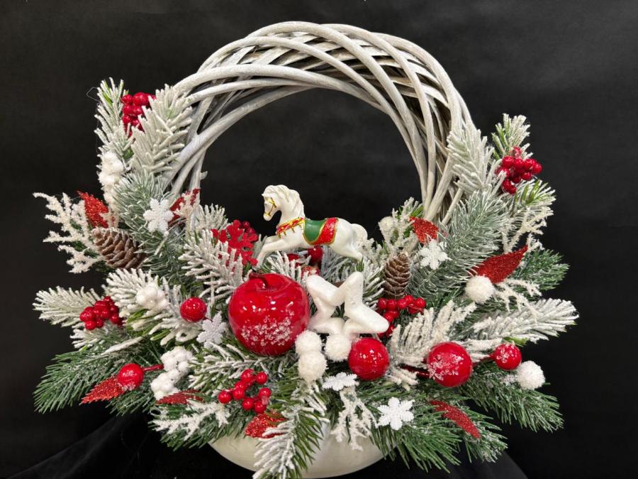 2025г. Цветы на новый год. Новогодняя композиция из искусственных цветов с лошадкой. На год "Огненой лошади" Цвет: Бело-зеленый с красным. Размер (40х25х30). Автор Наталия. Тел. для связи: +79161252945