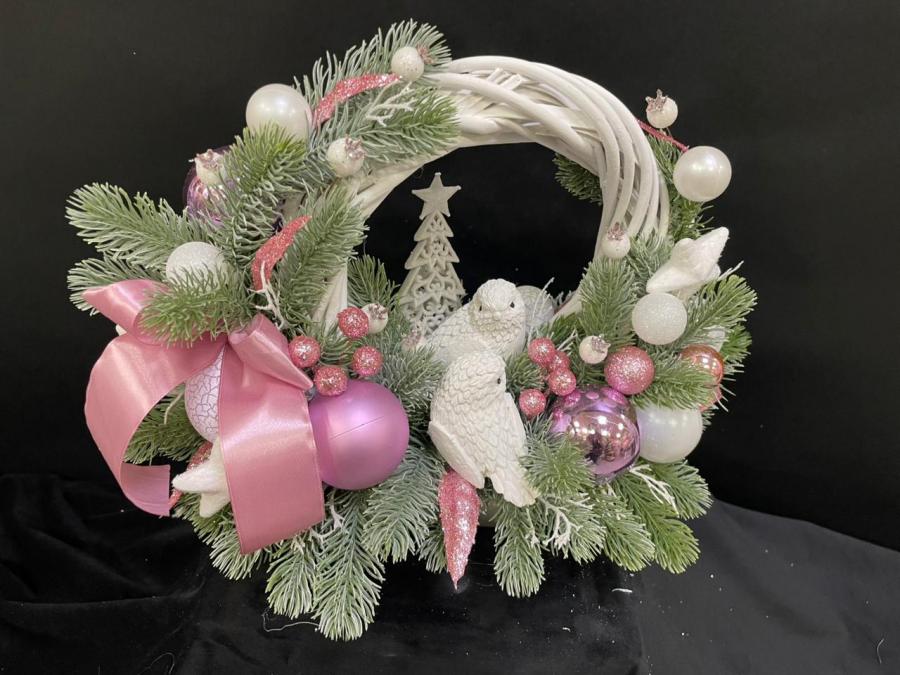 2025г. Цветы на новый год. Новогодняя композиция из искусственных цветов на стол с птичками. Цвет: Бело-зеленый с розовым. Размер (40х25х33)