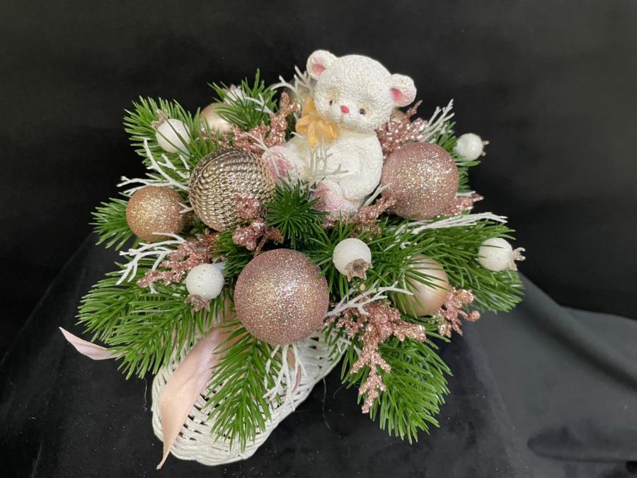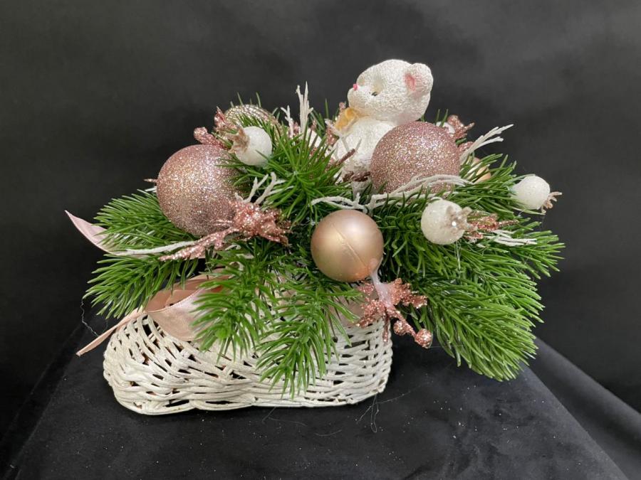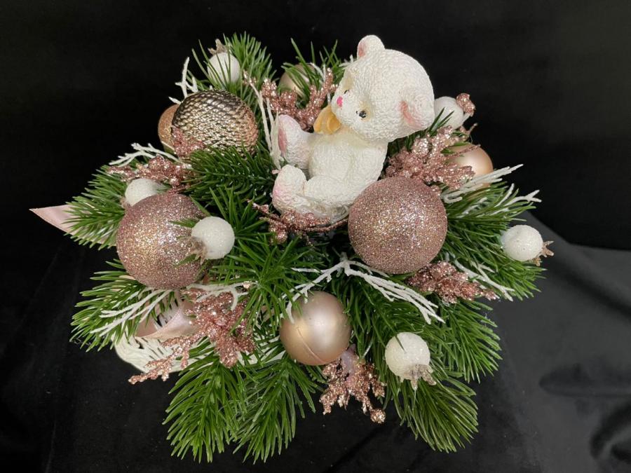 2025г. Новогодние цветы. Новогодняя композиция на стол из искусственных цветов в башмачке с игрушками и мишкой. Настольная. Цвет: Бело-зеленый с золотым. Размер (23х23х20).
