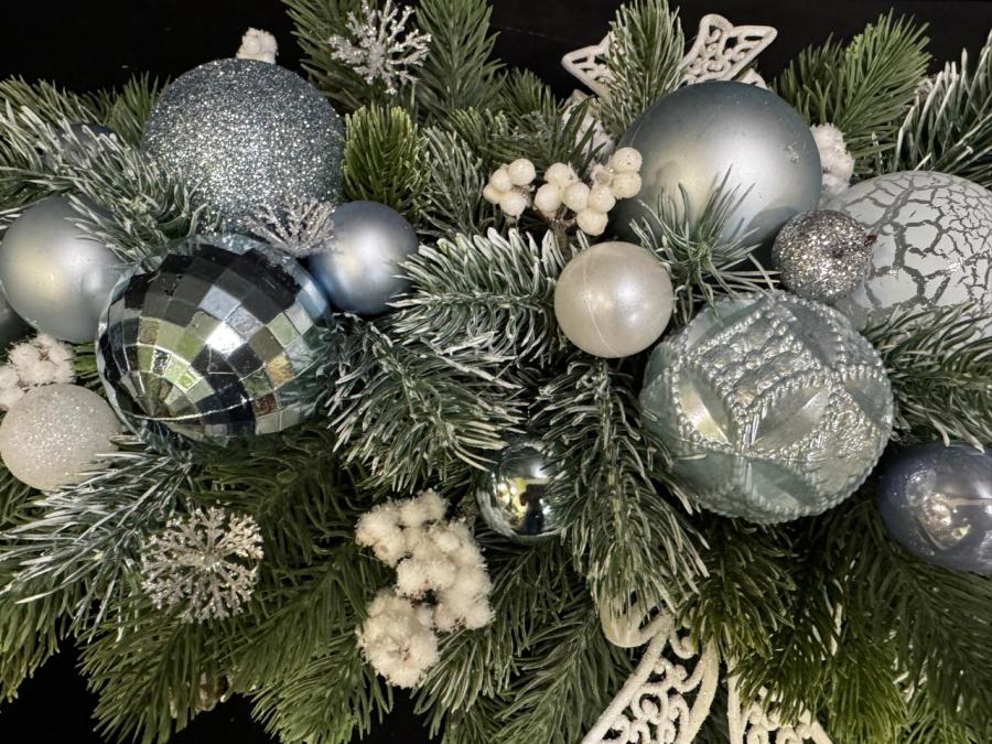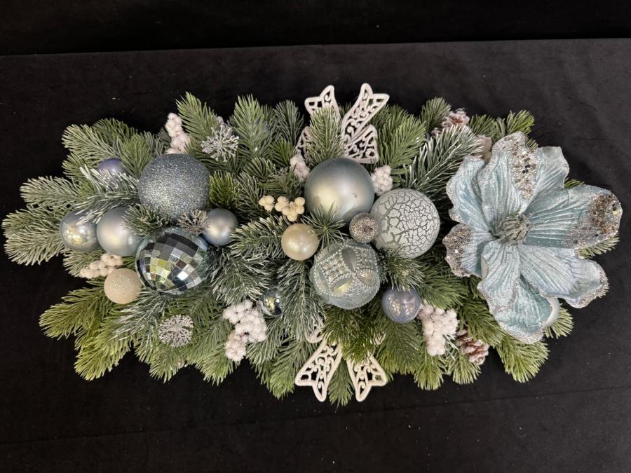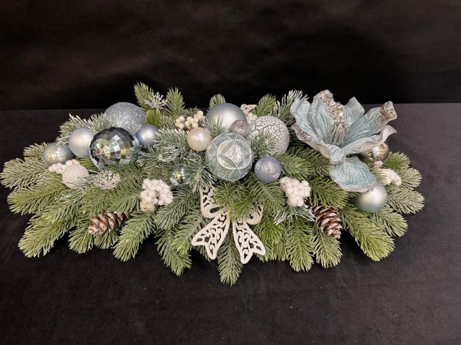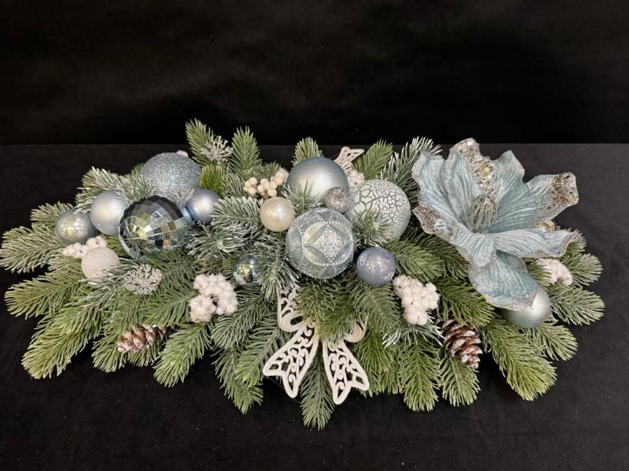 2025г. Новогодняя композиция из искусственных цветов с игрушками. Цвет: зеленый, голубой. Размер (55х28х14). Автор: Наталия. Тел. для связи: +79161252945