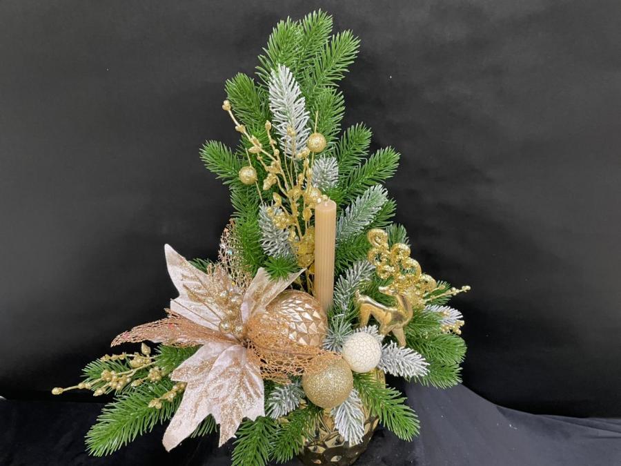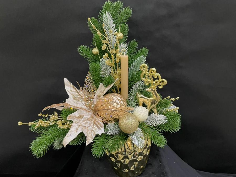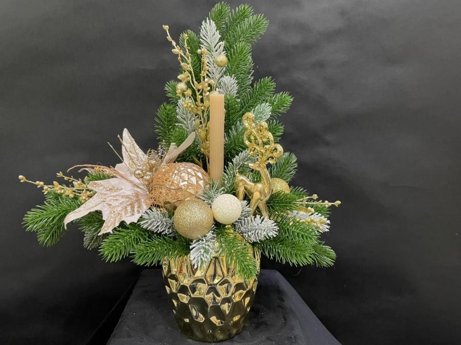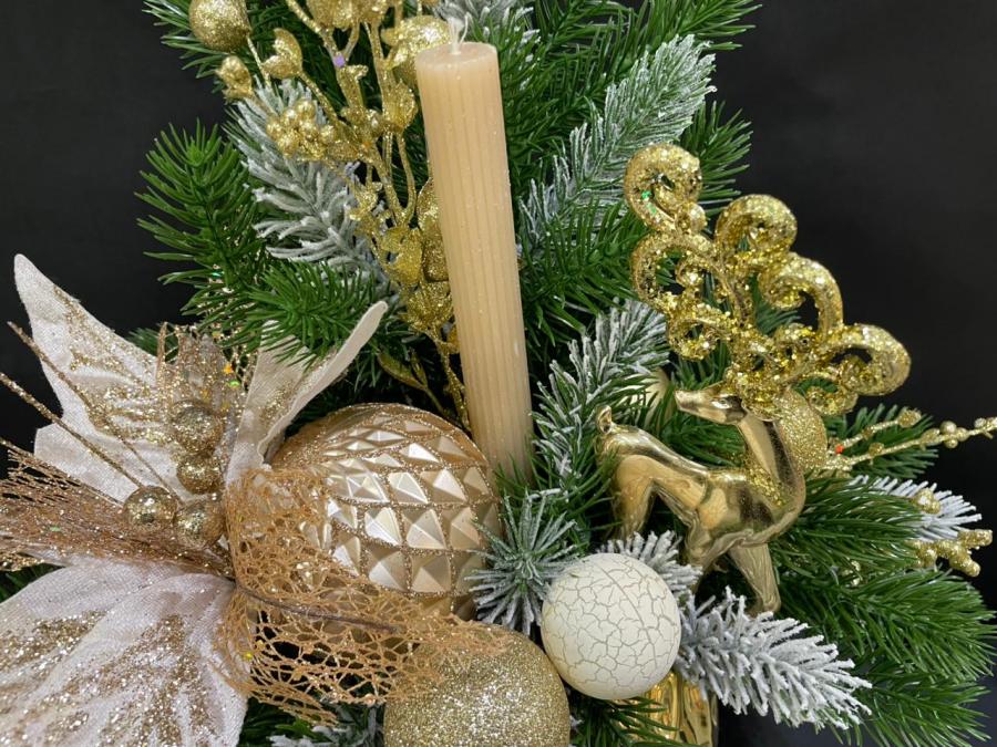 2025г. Новогодние цветы. Новогодняя композиция на стол из искусственных цветов со свечами и оленем. В вазе. Цвет: Бело-золотой с розовым. Размер (40х20х45) .