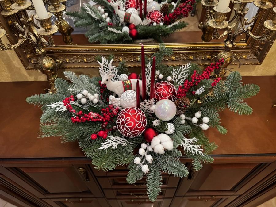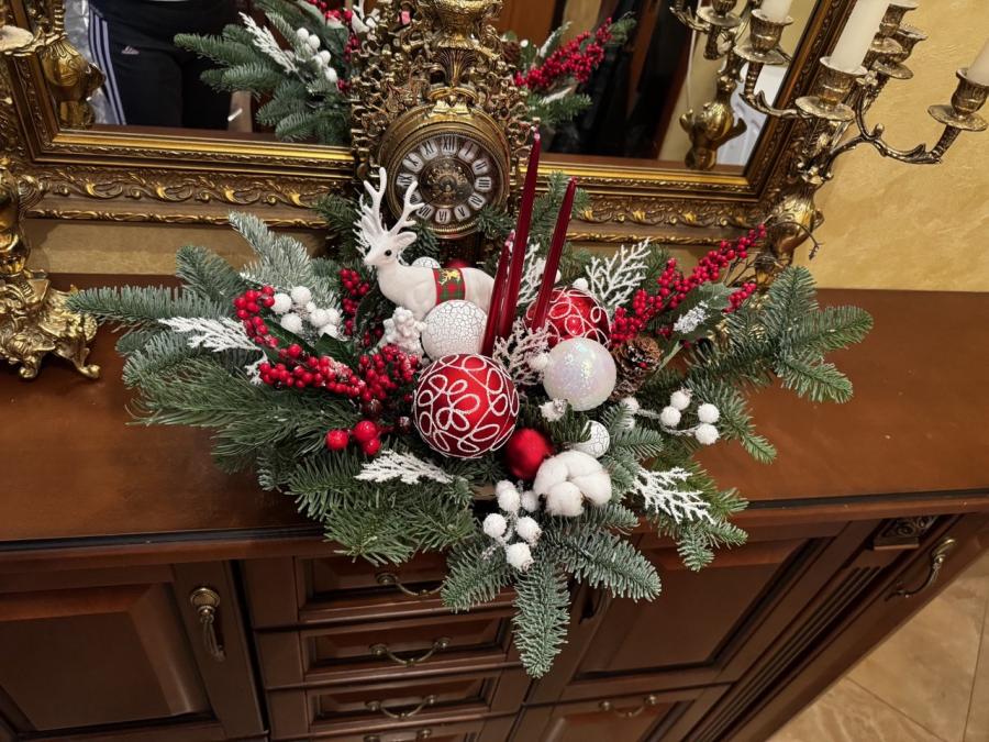 2025г. Новогодние цветы. Новогодняя композиция из искусственных цветов со свечами и оленим на стол. Цвет: Белый, зеленый с красным Размер (45х30х30) . Автор: Наталия. Тел. для связи: +79161252945