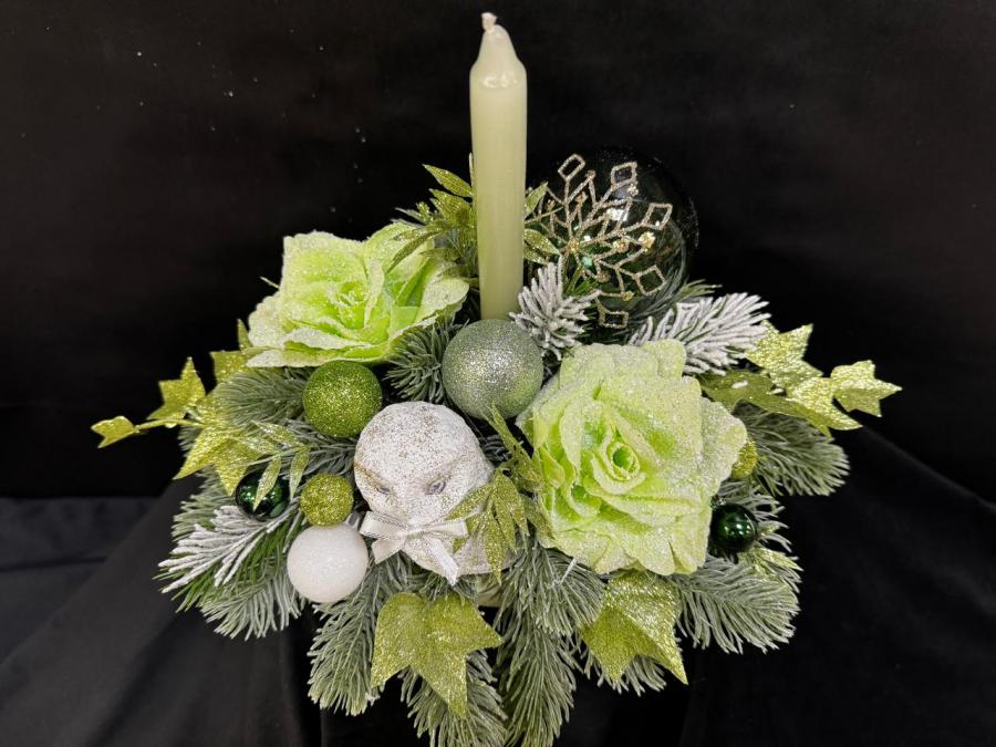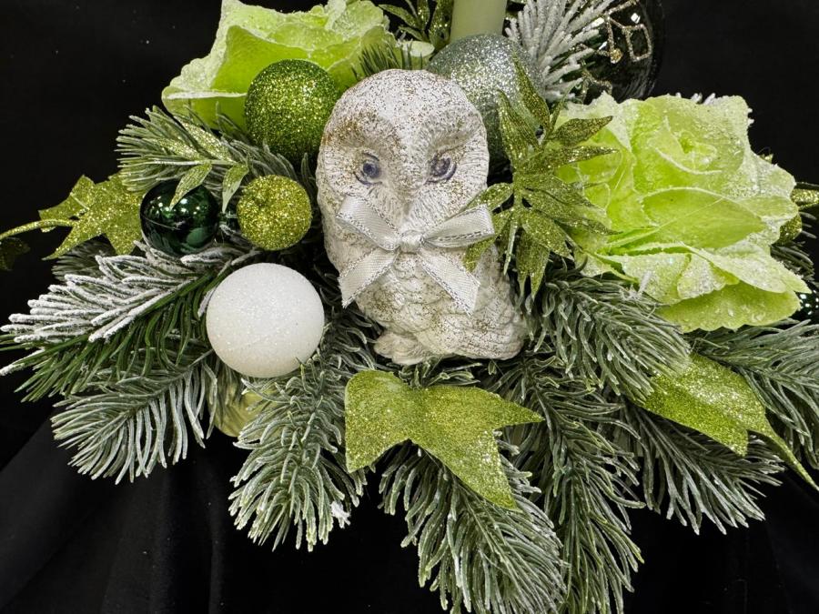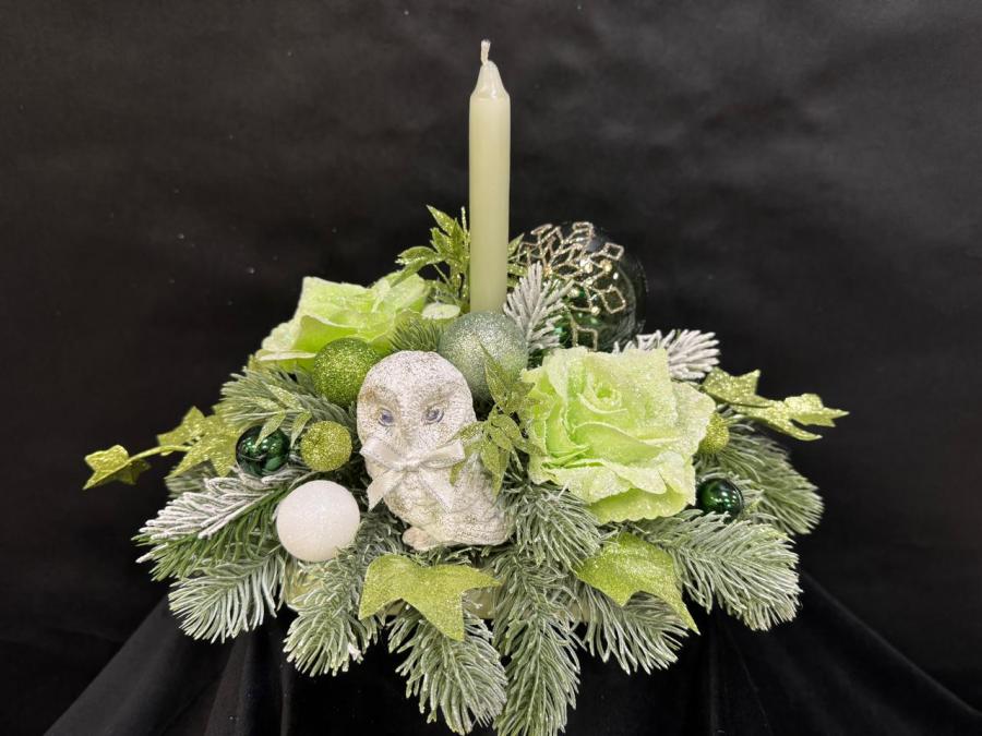 2025 г. Цветы на новый год. Новогодняя композиция со свечой из искусственных цветов и совой. Цвет: зелёный, серебрянный. Размер (36х30х25). Автор: Наталия. Тел. для связи: +79161252945