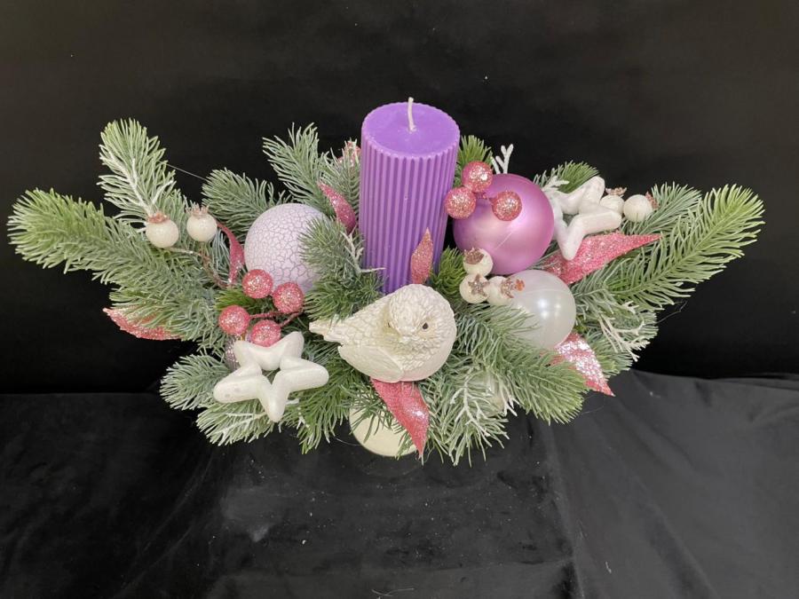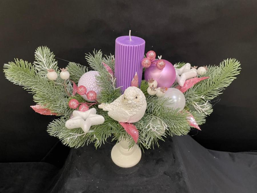 2025г. Новогодние цветы. Новогодняя композиция из искусственных цветов со свечой и птичкой. Цвет: Сиренево-зеленый с белым. Размер (35х20х30).
