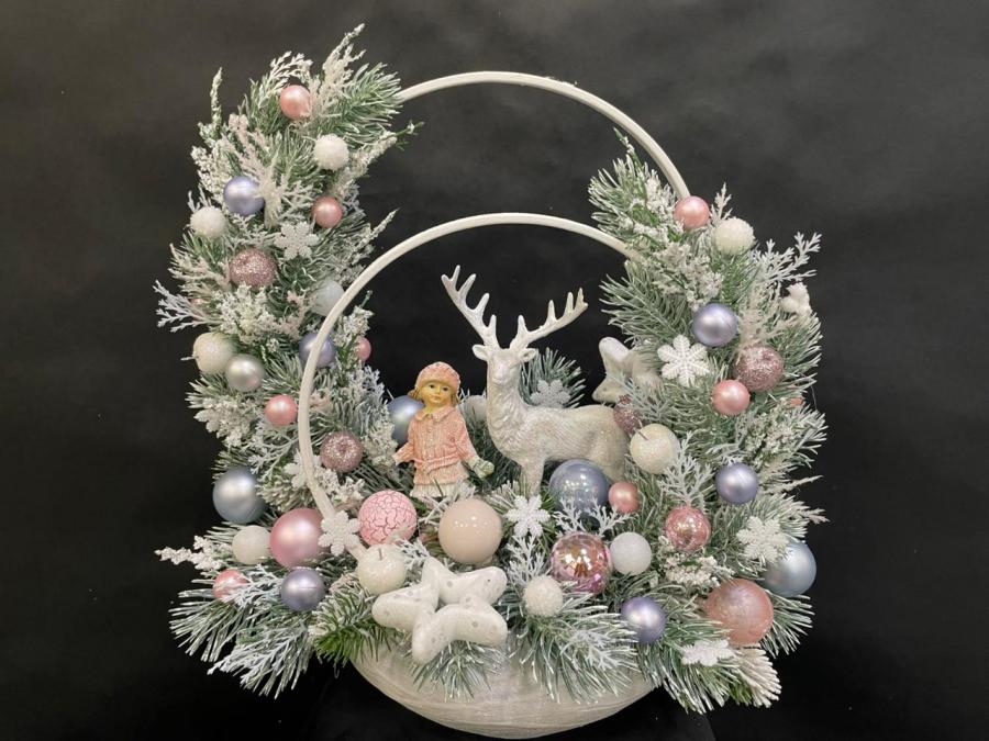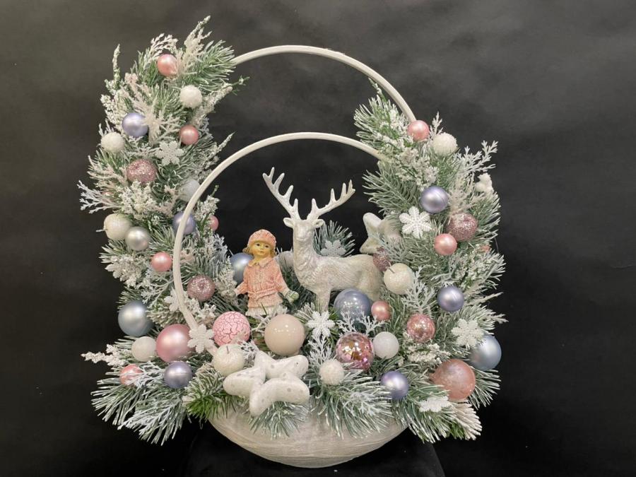 2025г. Новогодние цветы. Новогодняя композиция из искусственных цветов девочкой и оленим. Цвет: Бело-серебренный с розовым. Размер (30х20х33). Автор: Наталия. Тел. для связи: +79161252945