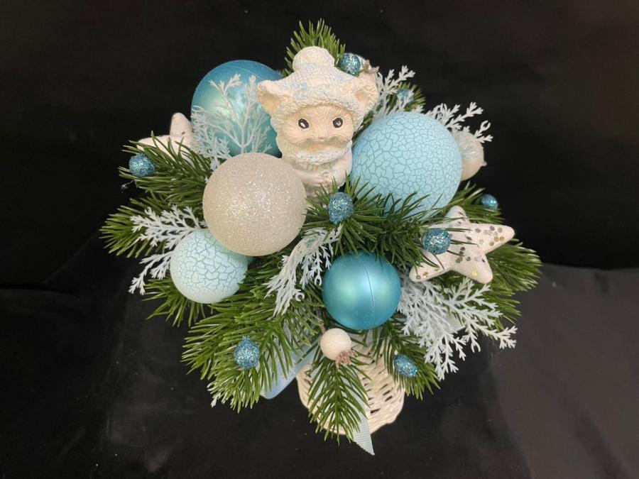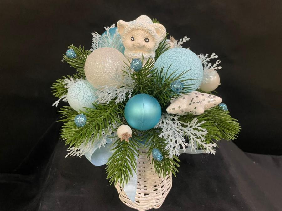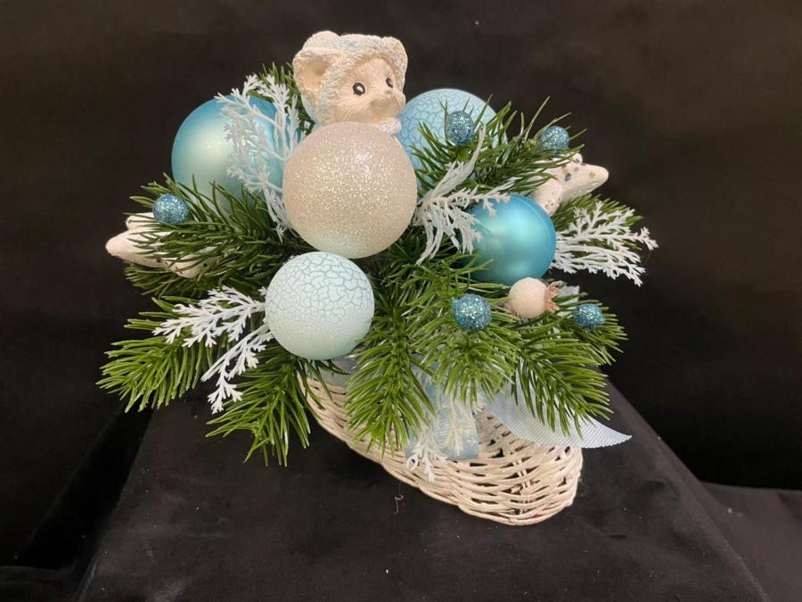 2025г. Новогодние цветы. Новогодняя композиция из искусственных цветов на стол в башмачке с игрушками и мышкой. Настольная. Цвет: Бело-зеленый с голубым. Размер (25х20х20).