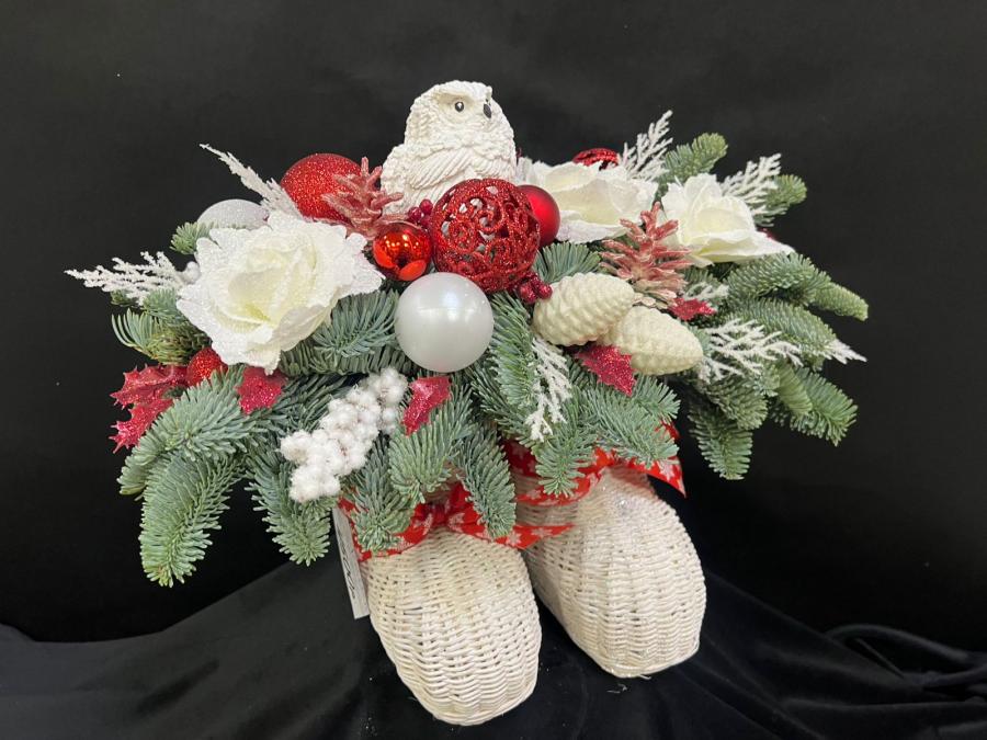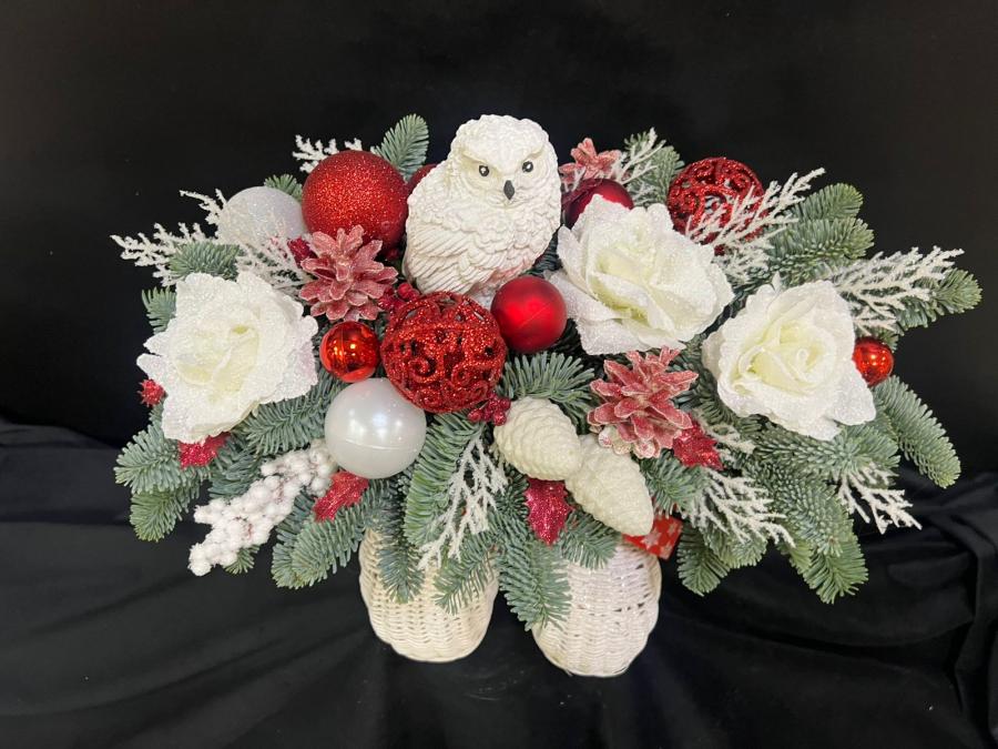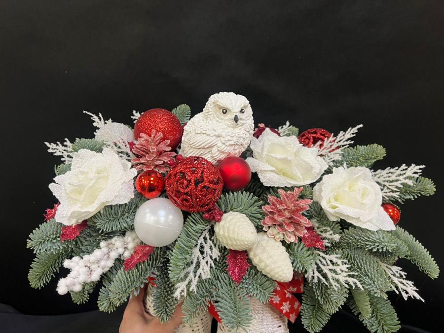 2025г. Новогодние цветы. Новогодняя композиция из живой ели нобилис на стол с птичкой. Цвет: Бело-зеленый с красным. Размер (45х25х35)