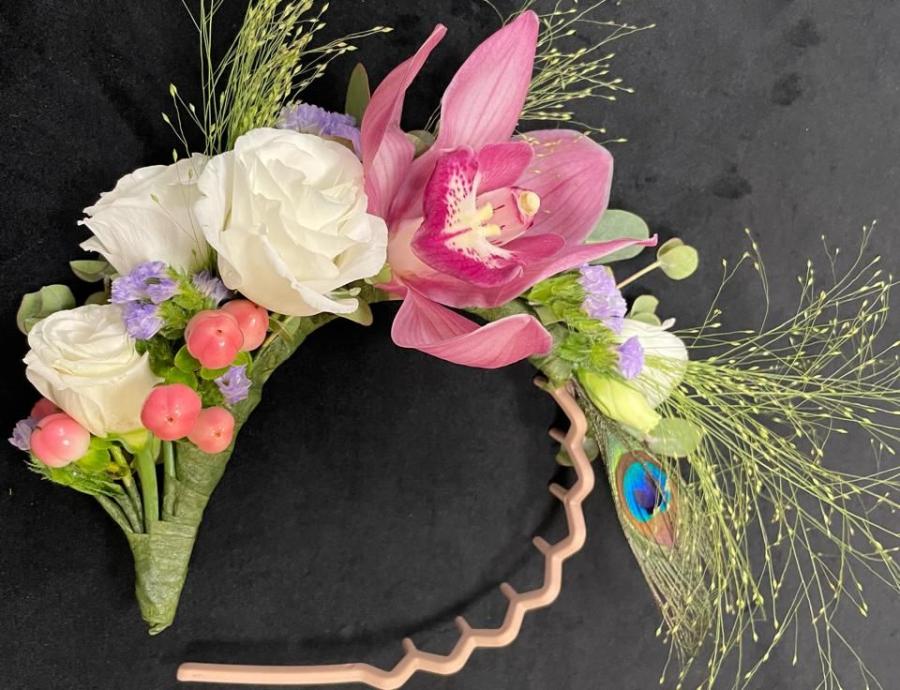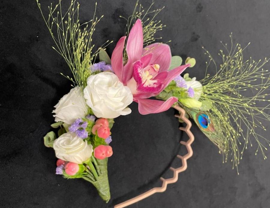 2025г. Ободок из живых цветов на голову. Состав: Орхидея, роза, статица, гиперикум, перья. Цвет: Розовый с белым. Размер 52-58 (Г)