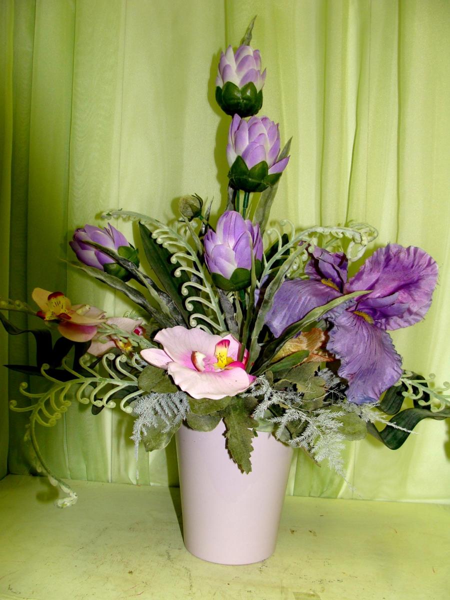 2010г. Композиция из искусственных цветов. В керамической вазе. В сиренево-кремовых тонах. Размер (20х20х25) Автор: Вавилова Наталия Евгеньевна. Тел. для связи: +79161252945