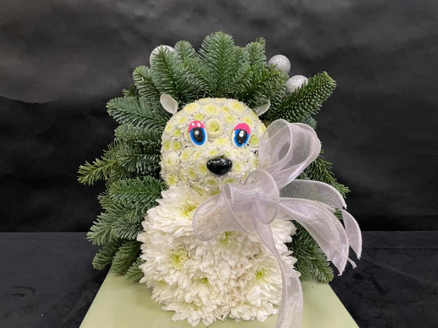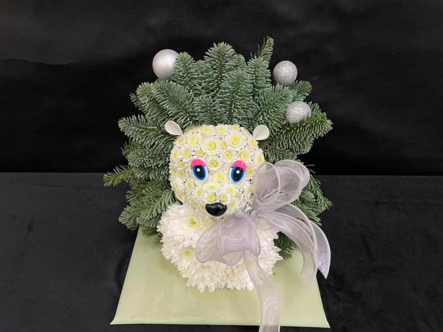 2025г. Ёжик из живых цветов и веток ели "Нобилис". Состав: Хризантема, ель, ёлочные игрушки. Цвет: Белый, зелёный. Размер (26х20х32)