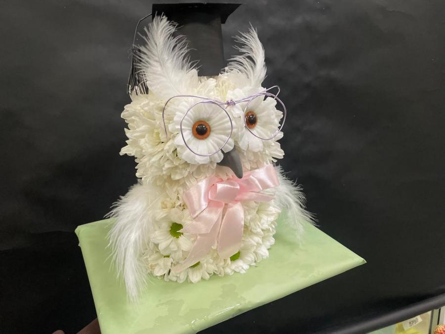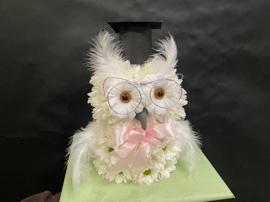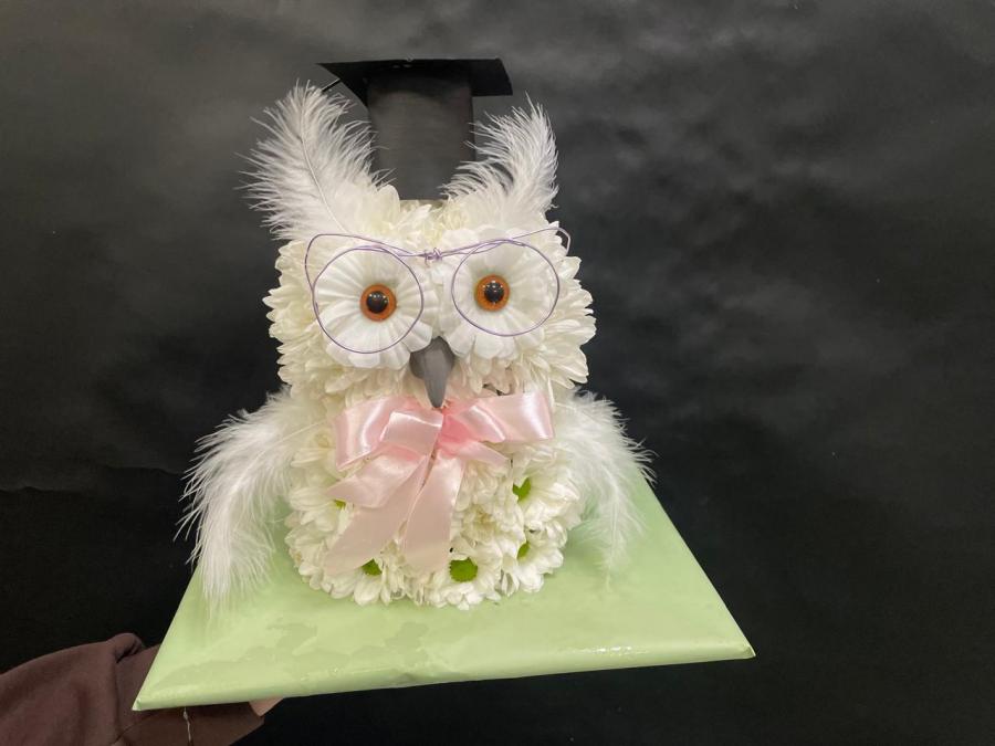 2025г. Игрушка из живых цветов. Форма: Сова. В белых тонах с розовым. Состав: Хризантема. Размер (30х20х30)