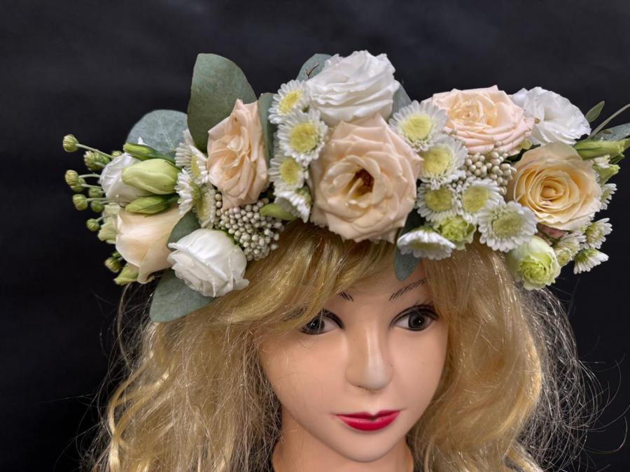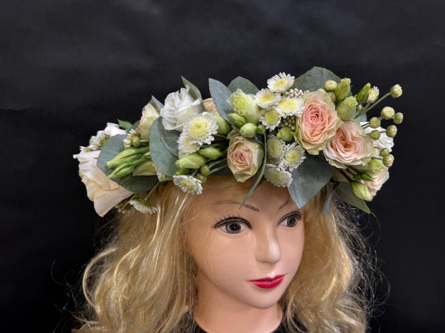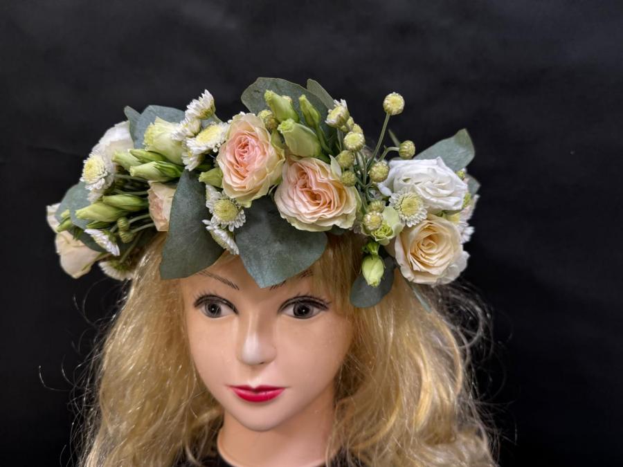 2025г. Цветы на свадьбу. Аксесуар для невесты. Венок из живых цветов на голову. Состав: Роза, эустома, хризантема. Цвет: Кремово белый с зеленым. Размер 52-56. Прекрасно украсит наряд невесты (А)