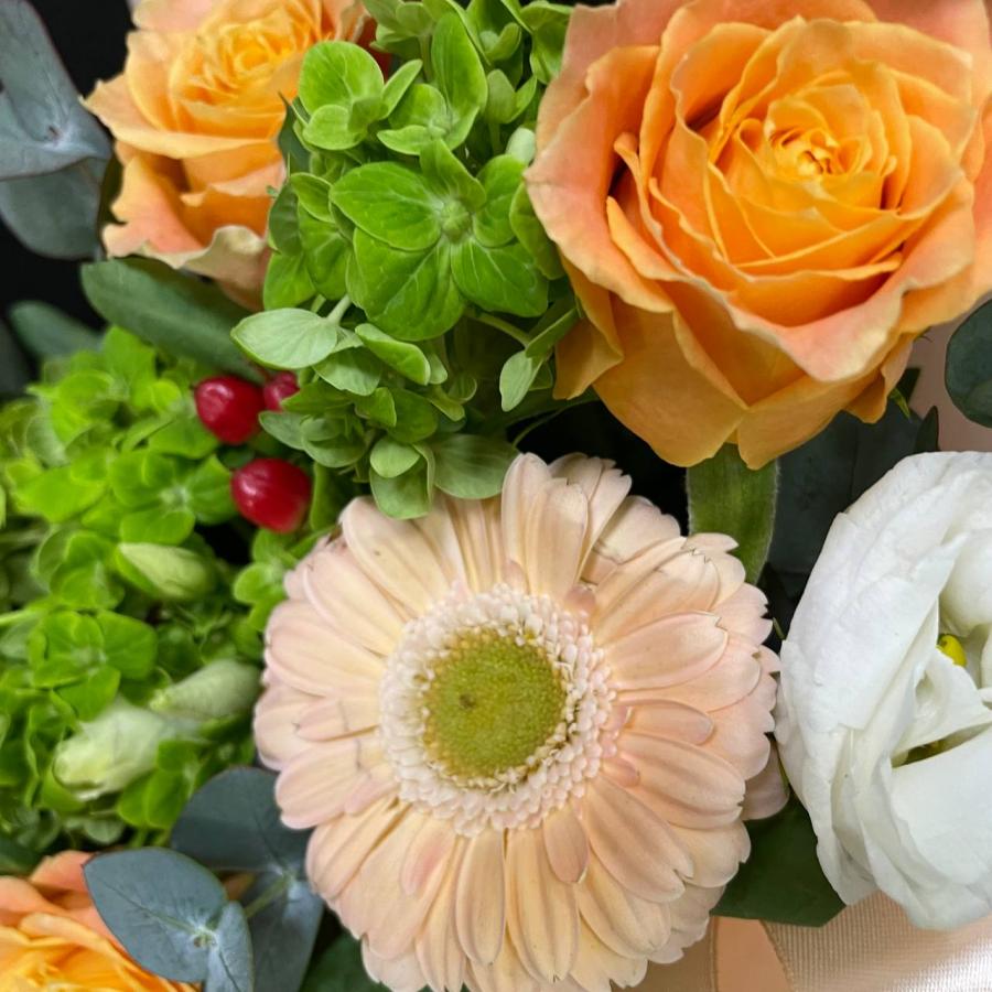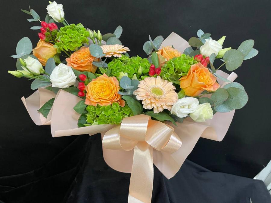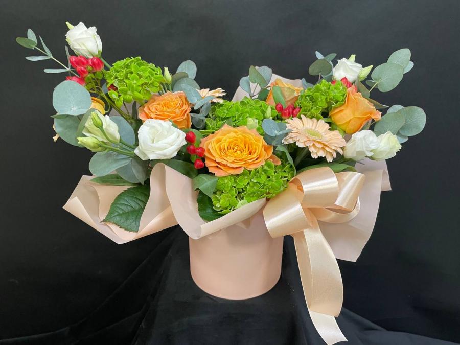 2026г. Цветы в шляпной коробке. Форма: Круглая. Состав: Гортензия, роза, эустома, гиперикум, гербера. Цвет: Кремовый, белый с зеленым. Размер (40х25х35)