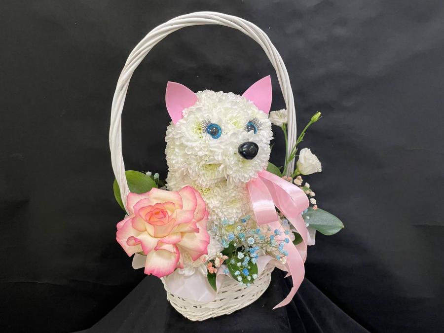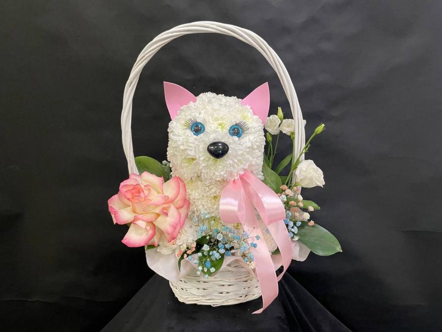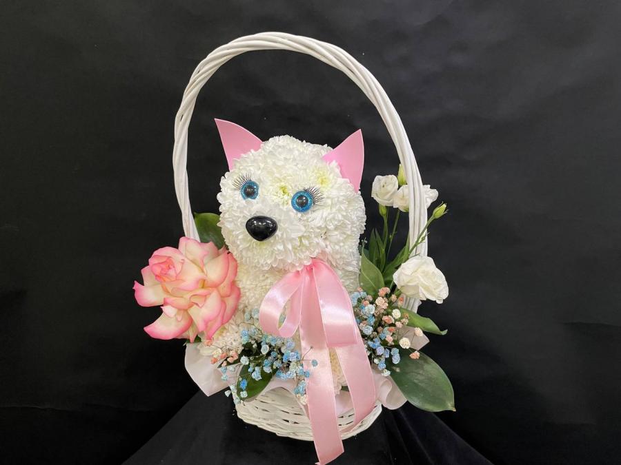 2026г. Игрушка из живых цветов. Собачка из цветов в корзине. Состав: Хризантема, французская роза, эустома, гипсофила. Цвет: Белый с розовым. Размер (33х17х40)