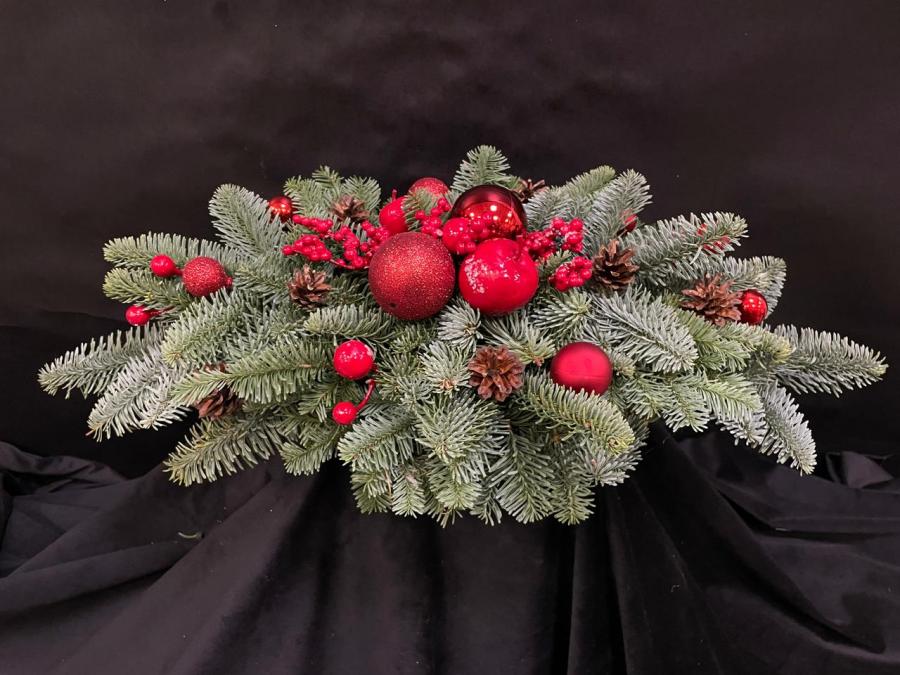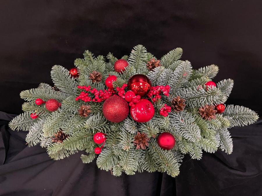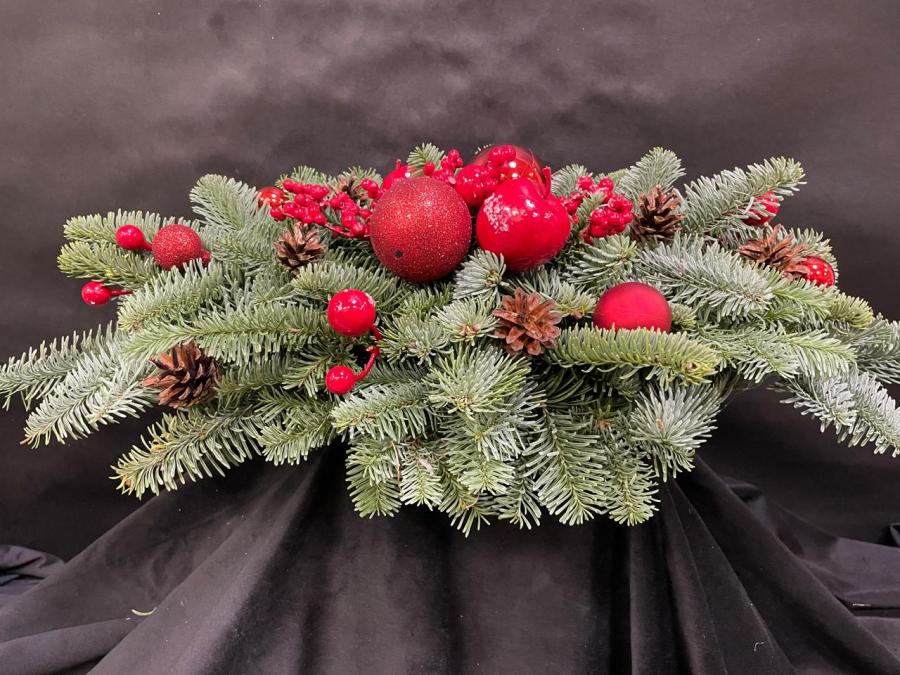 2025 г. Новогодняя композиция с живыми ветками канадской ели «Нобилис», шишками, и красными шариками. Цвет: зелёный, красный. Размер (60х30х16)