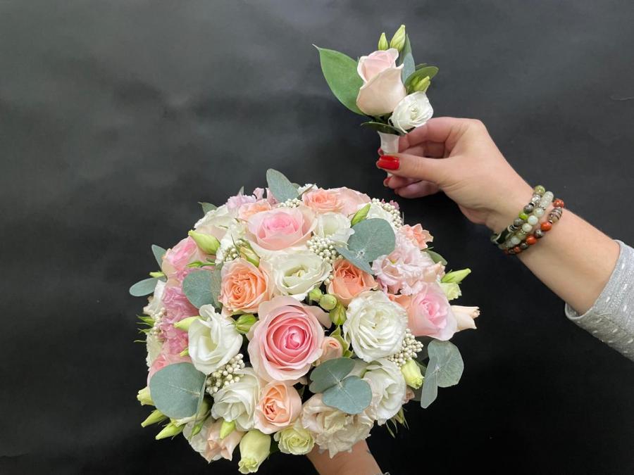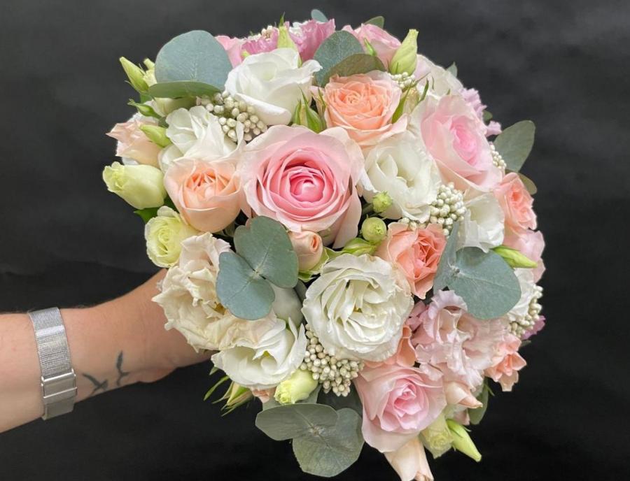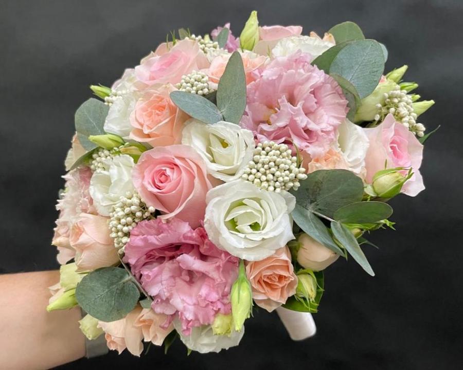 2025г. Букет невесты. Круглый. Состав: Роза, эустома, озатамус, эвкалипт. Цвет: Белый, розовый. Размер: д. - 27 см., в. - 27 см., ш. - 27 см.