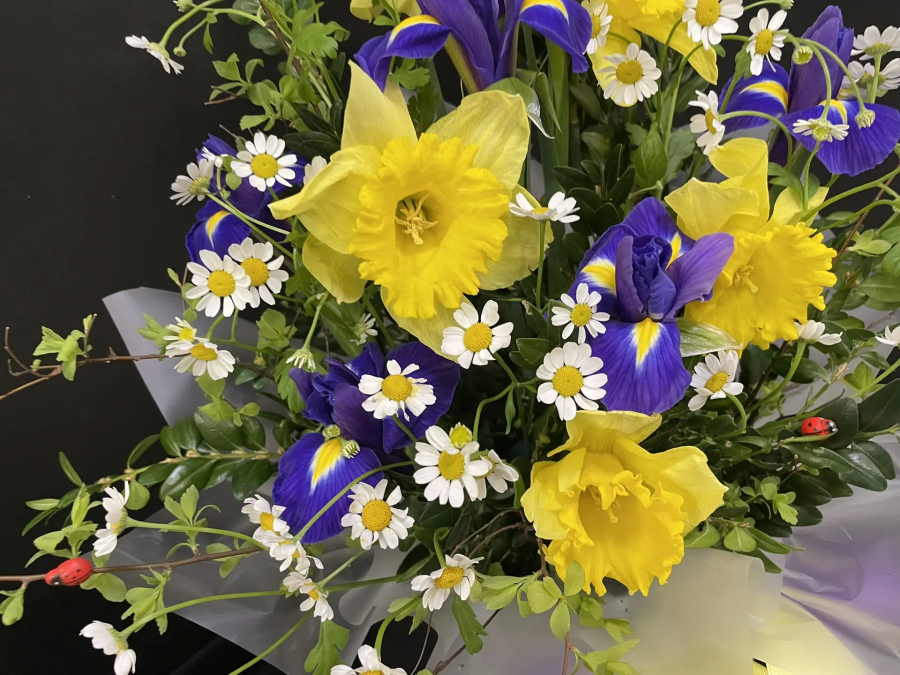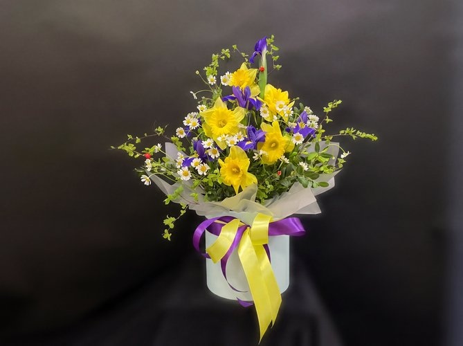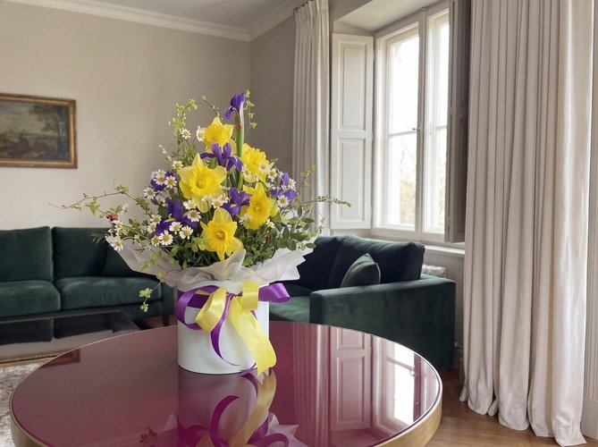 2026г. Цветы в шляпной коробке. Форма: Круглая. Состав: Нарцис, ирис, матрикарий, зелень. Цвет: Желтый, фиолетовый с зеленым. Эта стильная праздничная композиция с ассиметричной формой сочетает в себе разные формы, яркие краски и палитру фактур. Голубоватая шляпная коробка и воздушные банты завершают задумку флориста. Интересная интерьерная композиция «Текстурный микс» из живых цветов — выбор дизайнера для фотосессии или витрины, прекрасный подарок просто так, подарок на день рождения, подходит для оформления праздничного стола, как эмоциональная нотка для домашнего интерьера.
