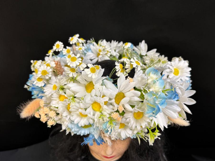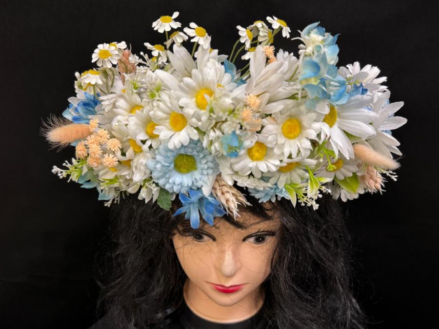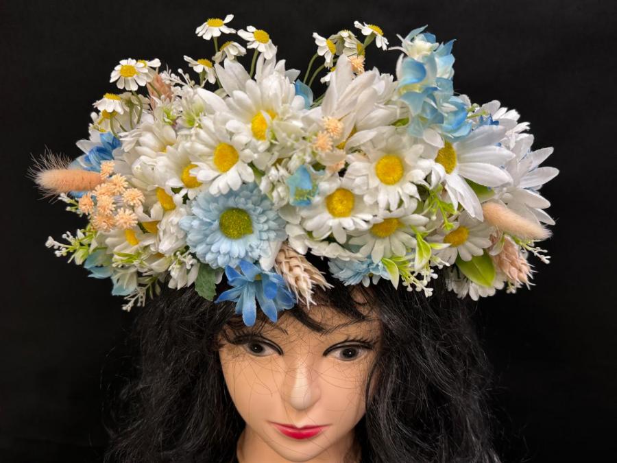 2025г. Венок объемный из искусственных цветов на голову. Состав: Ромашки, лютики, колоски. Цвет: Бело кремовый с голубым. Размер 52-58 (Б)