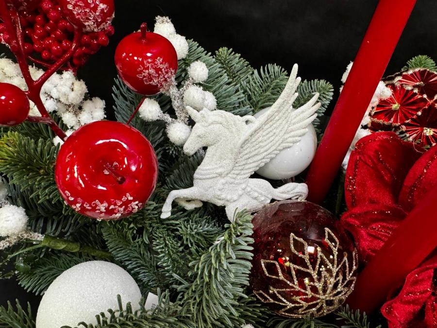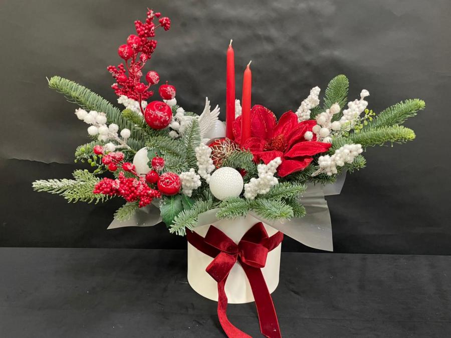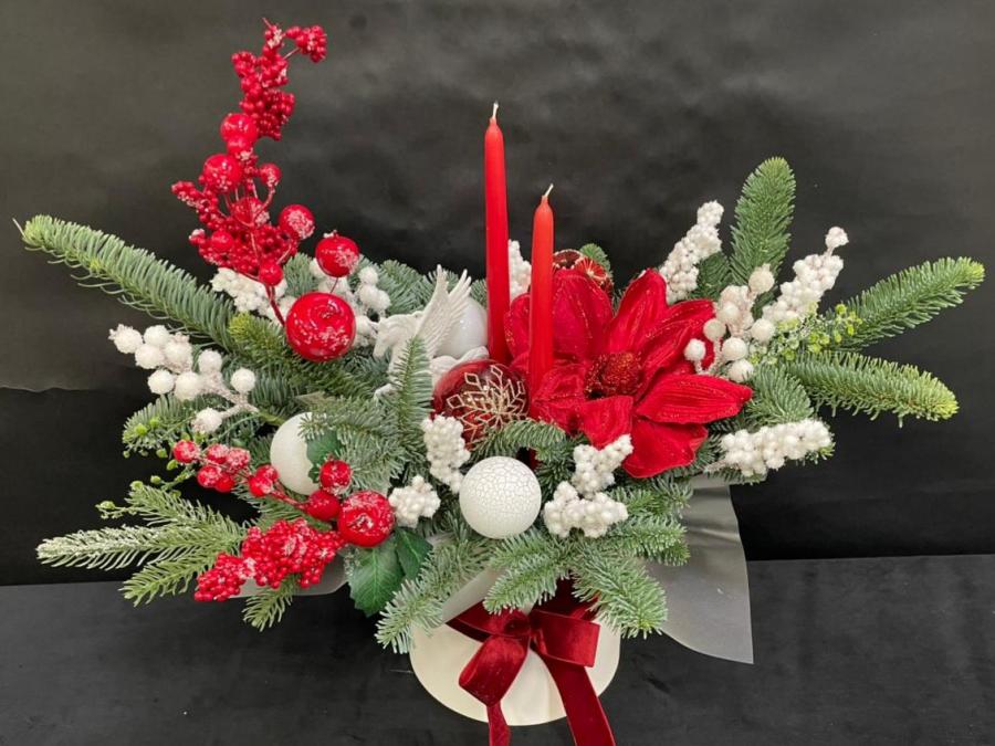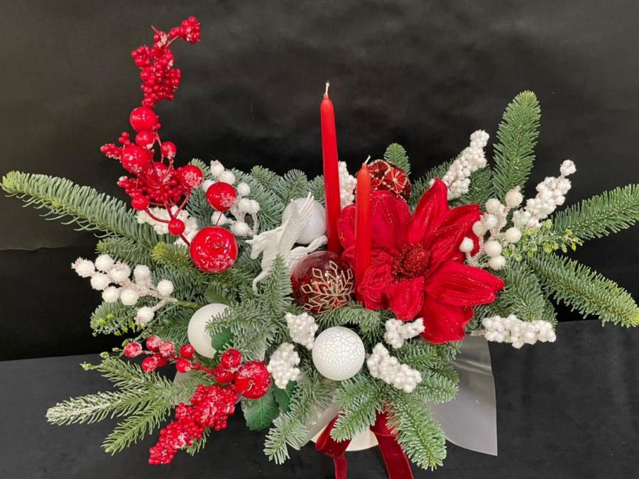 2025г. Новогодняя композиция-букет с живыми ветками канадской ели «Нобилис», со свечами, прздничными игрушками. Знак зодиака "Лошадь". Цвет: зелёный, красный. Размер (56х30х53)
