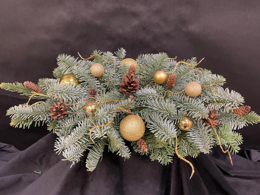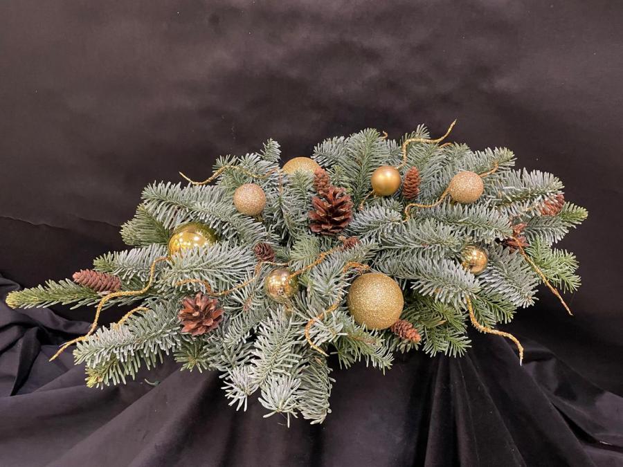 2025 г. Новогодняя композиция с живыми ветками канадской ели «Нобилис», шишками, и золотыми шариками. Цвет: зелёный, золотой. Размер (48х23х10)