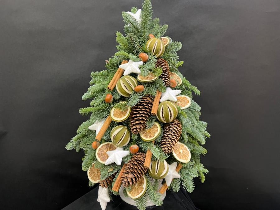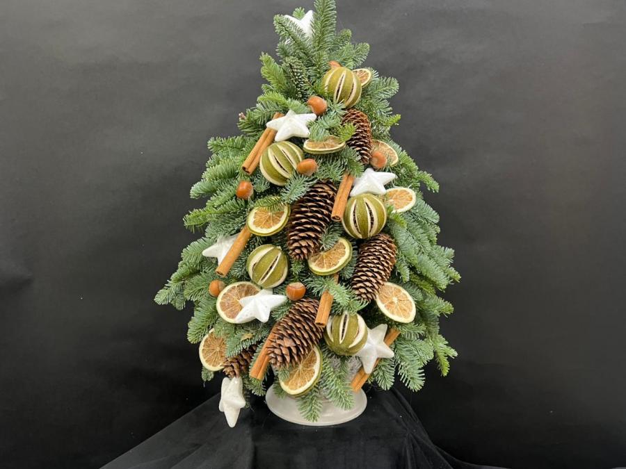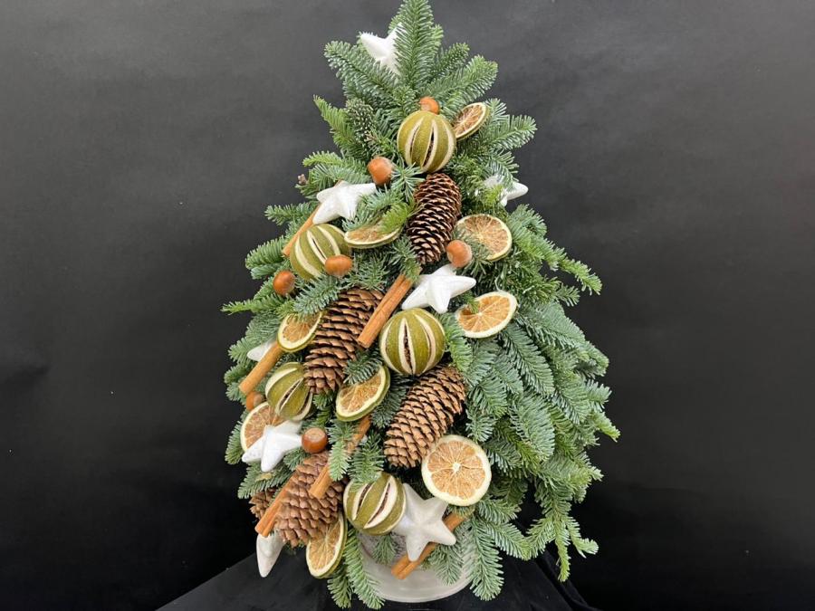 2025 г. Новогодние цветы. Новогодняя ёлка из. живых веткок канадской ели «Нобилис», с прздничными игрушками, шишками, корицей, лимоном. Цвет: зелёный, золотой. Размер (35х35х53)