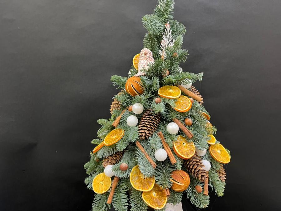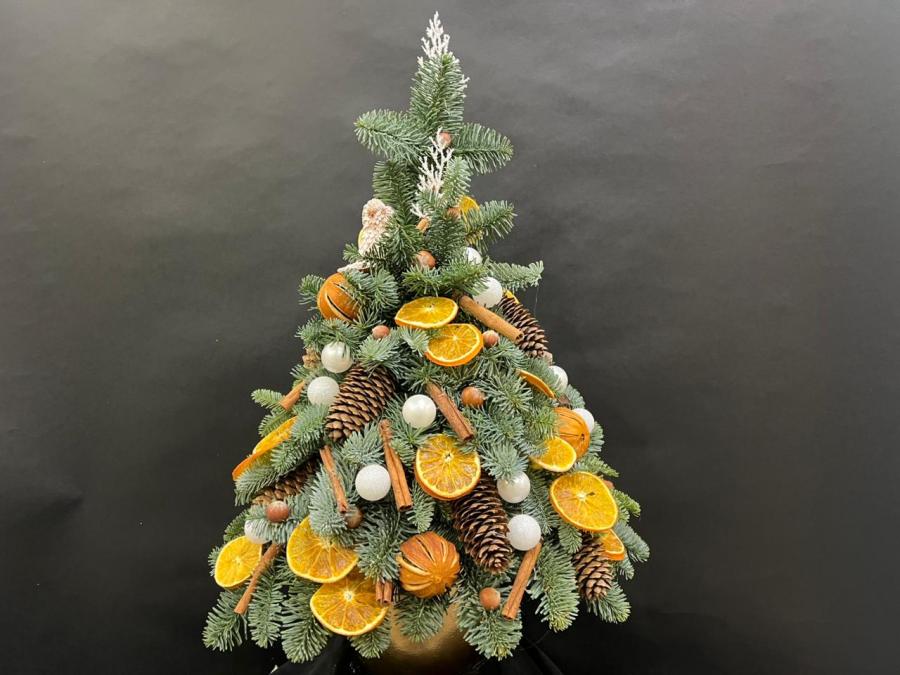 2025 г. Новогодние цветы. Новогодняя ёлка из. живых веткок канадской ели «Нобилис», с прздничными игрушками, шишками, корицей, лимоном. Цвет: зелёный, золотой. Размер (40х40х65)